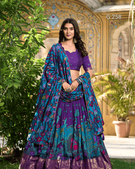 Kalamkari Print Tasar Silk Lehenga with Foil Work Border – G 261 Purple