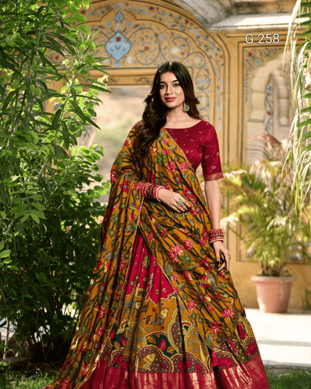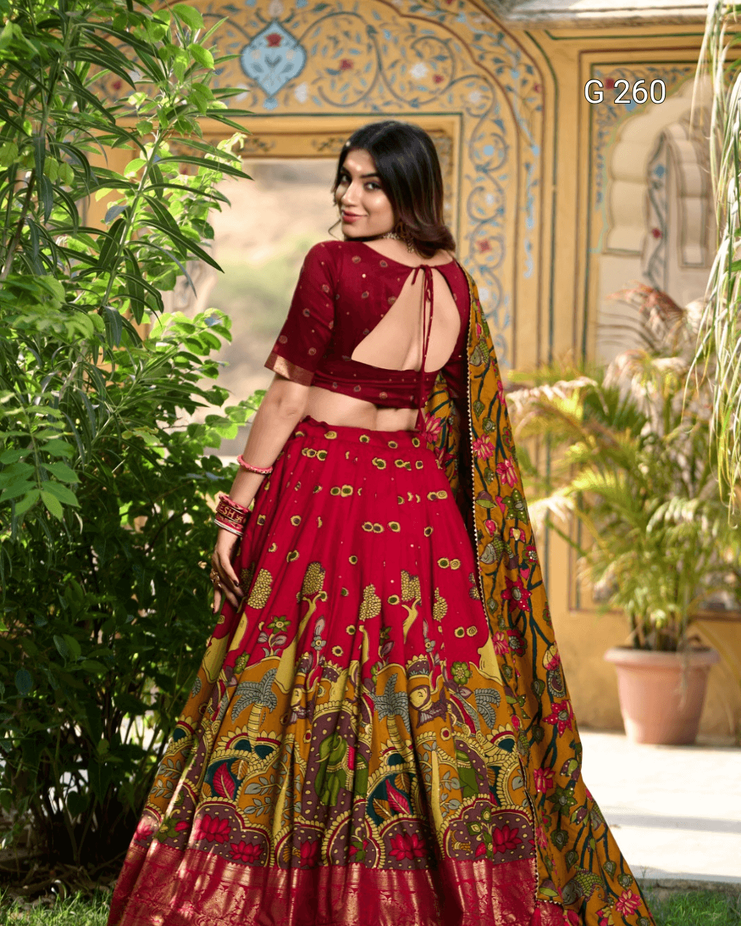 Kalamkari Print Tasar Silk Lehenga with Foil Work Border – G 261 Red