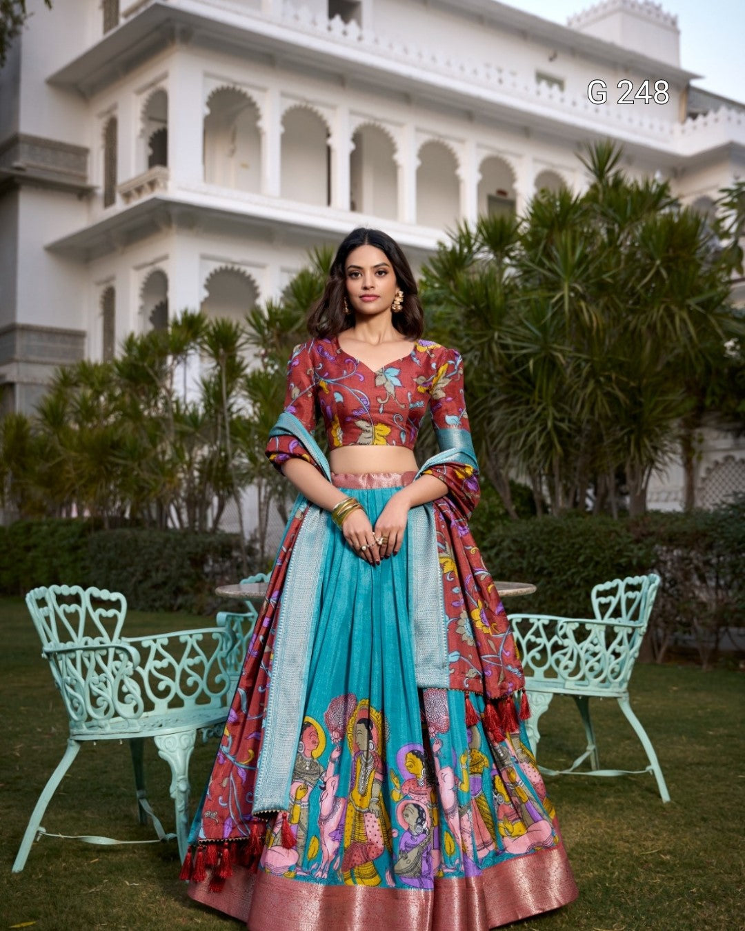 Kalamkari Printed Dola Silk Lehenga with Zari Weaving Border – G 248 Firozi
