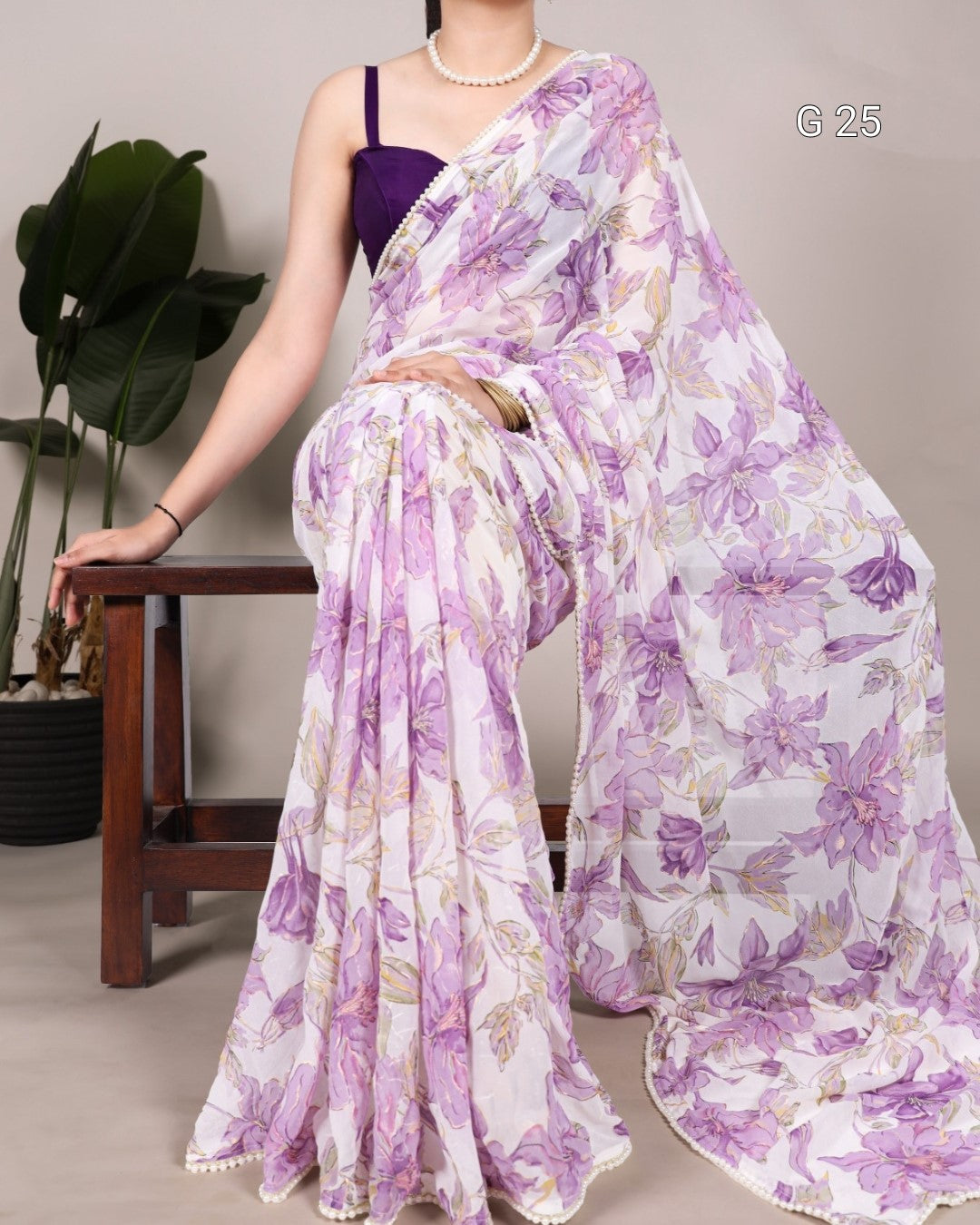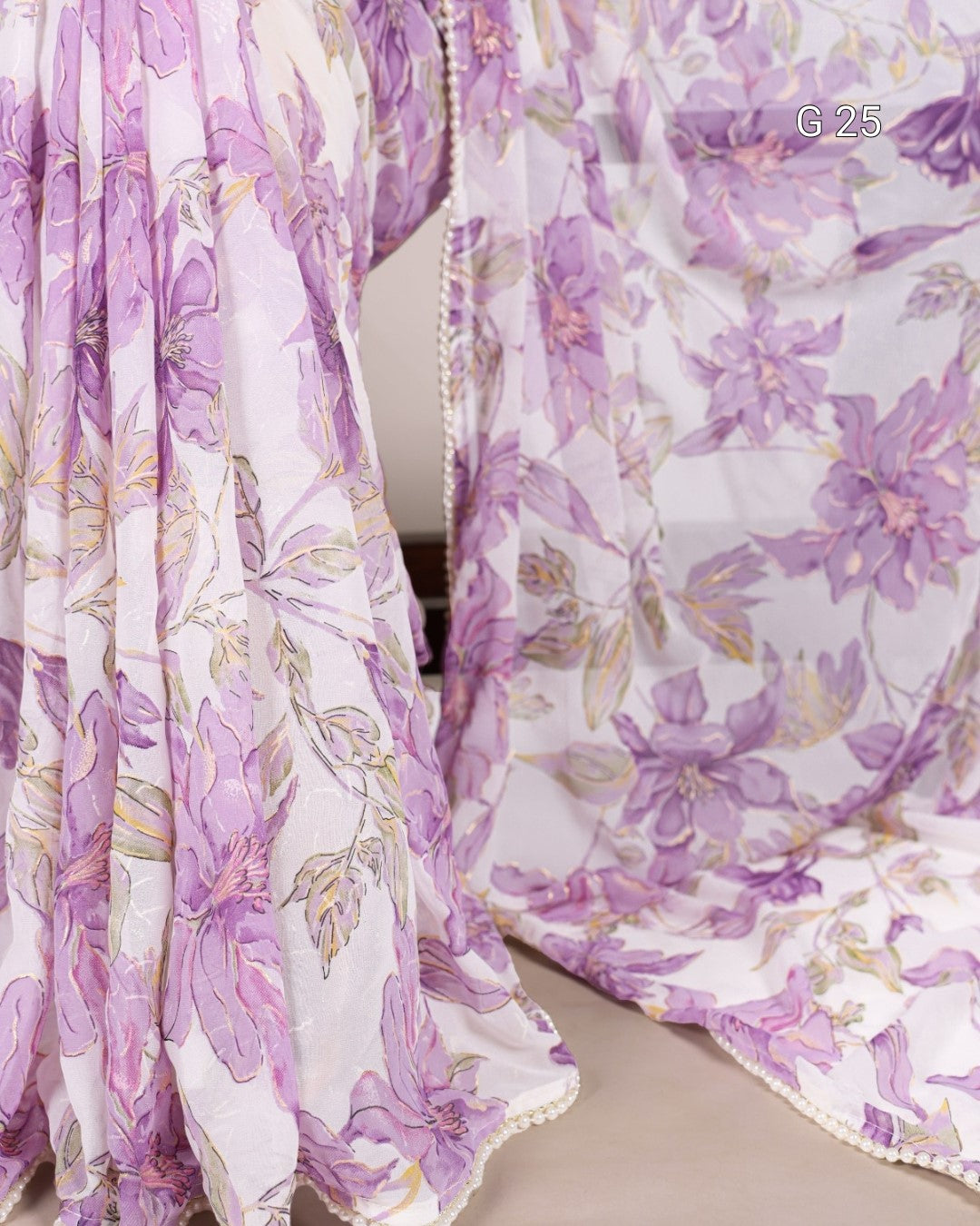 Lavender Weightless Marbal Saree with Floral Print & Pearl Lace Border – G 25 Lavender