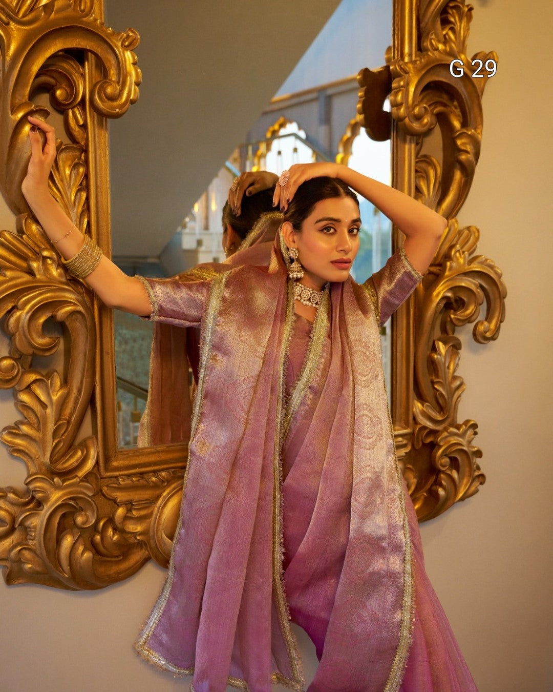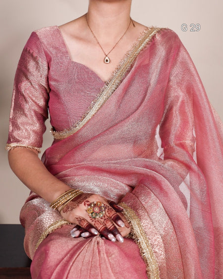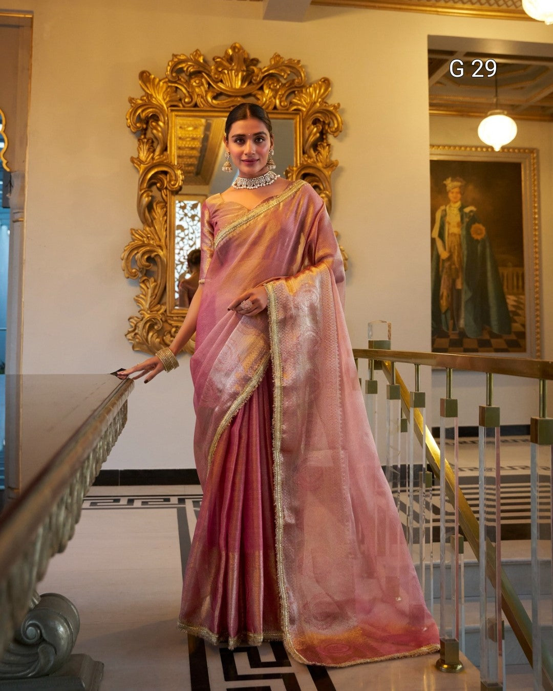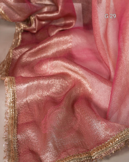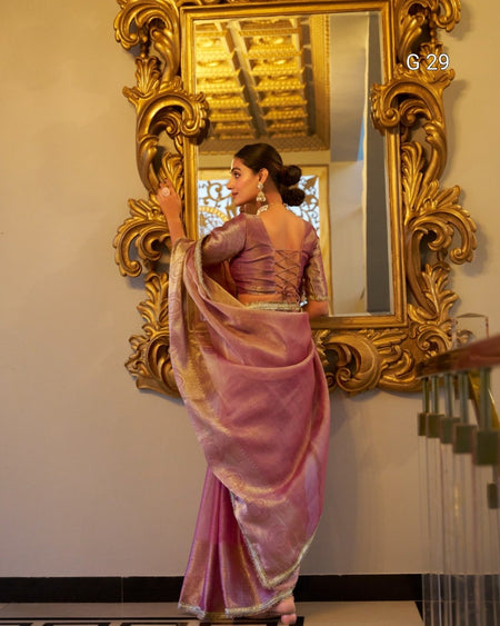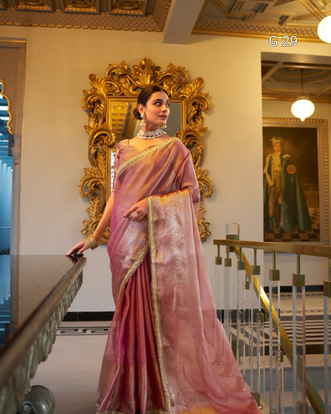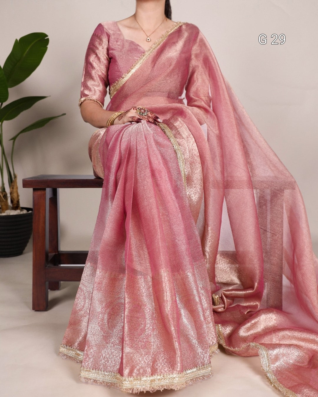Light Pink Tissue Shimmer Saree with Zari Weaving & Sequins Lace Border – G 29 Light Pink