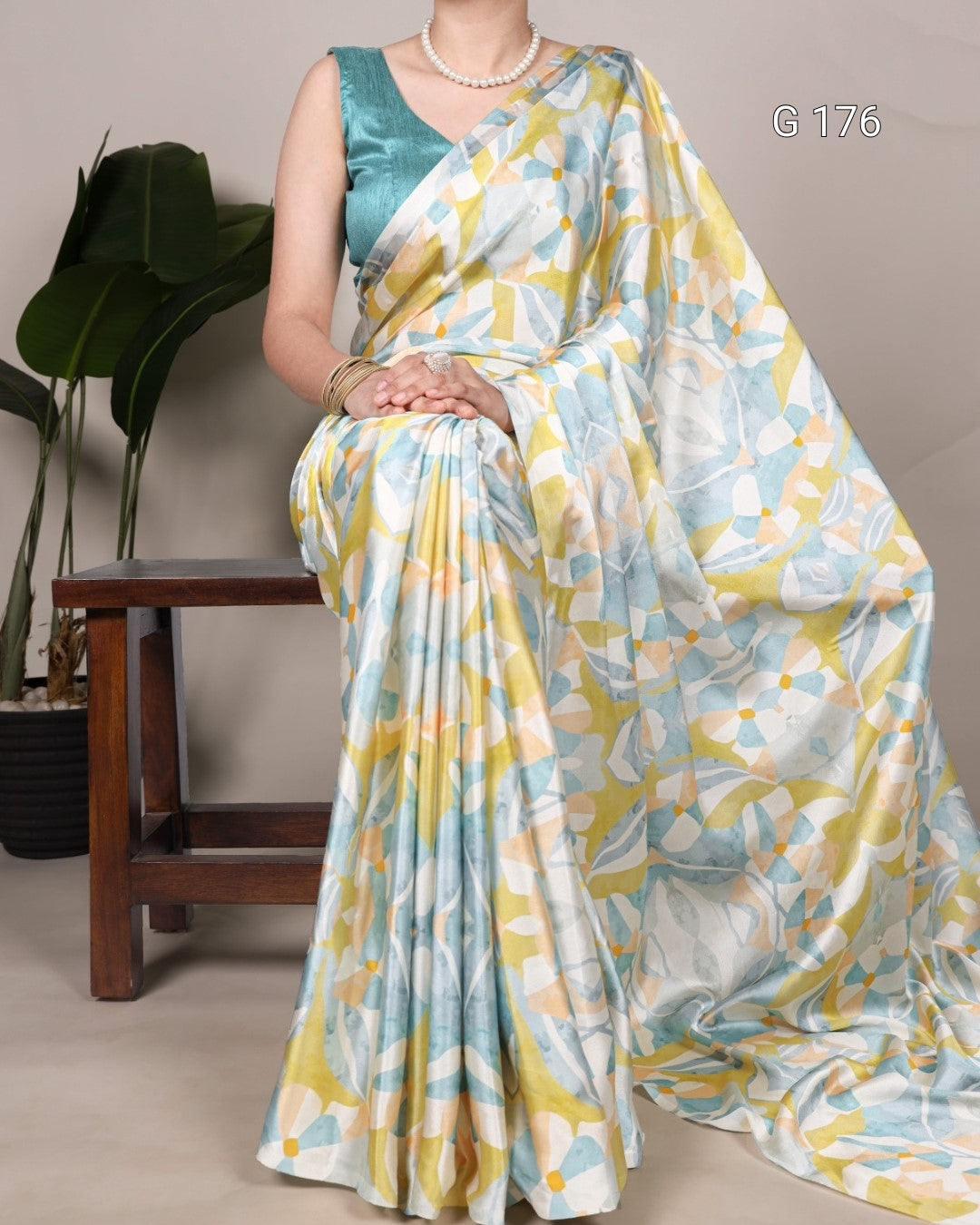 Light Yellow Satin Silk Saree with Floral Print – G 176 Light Yellow