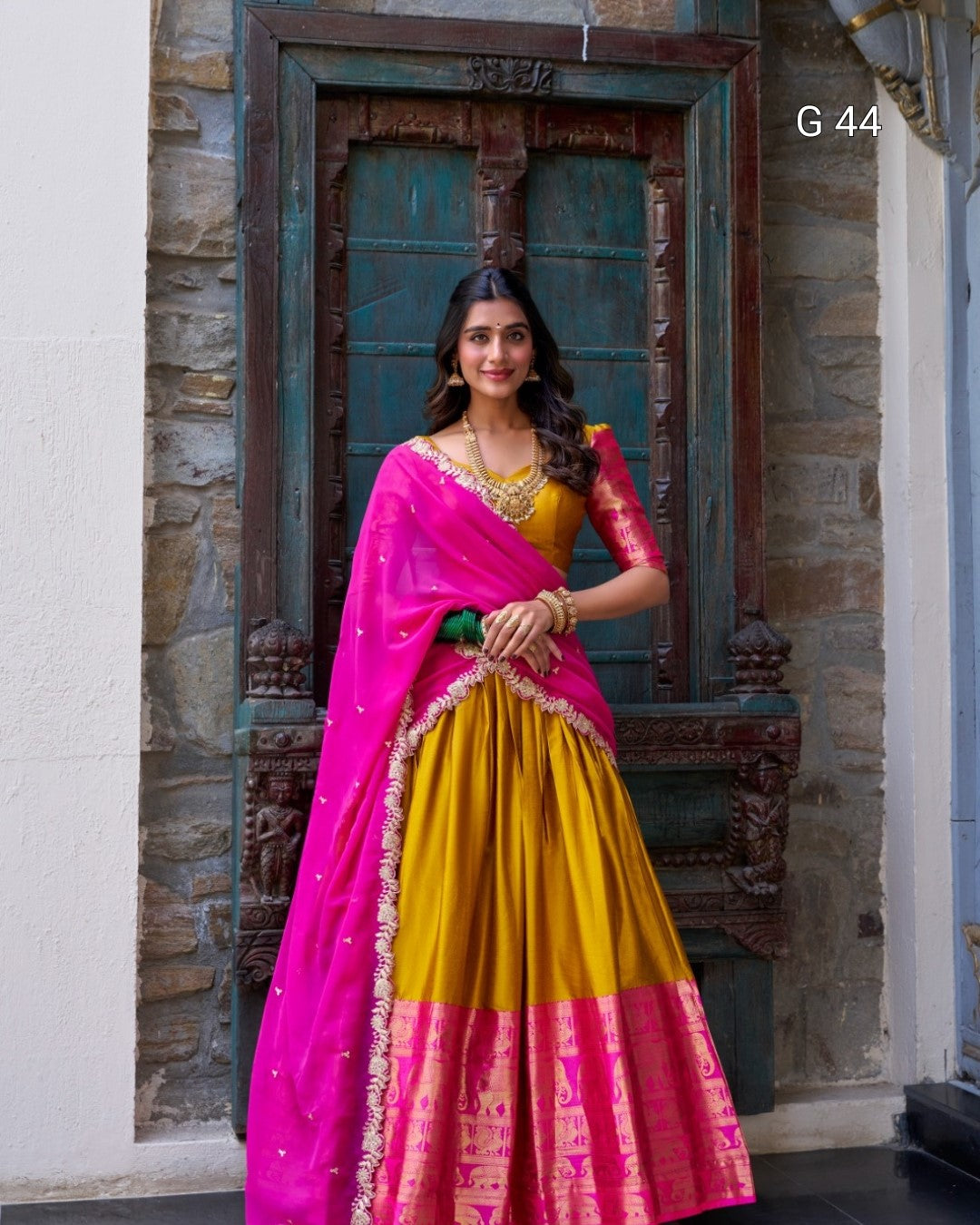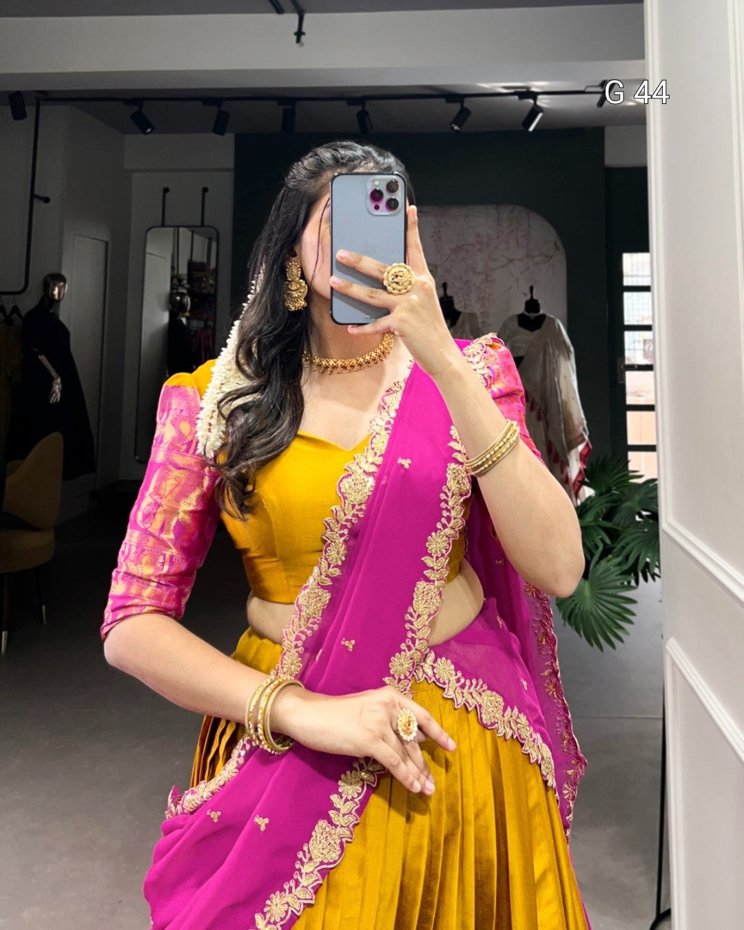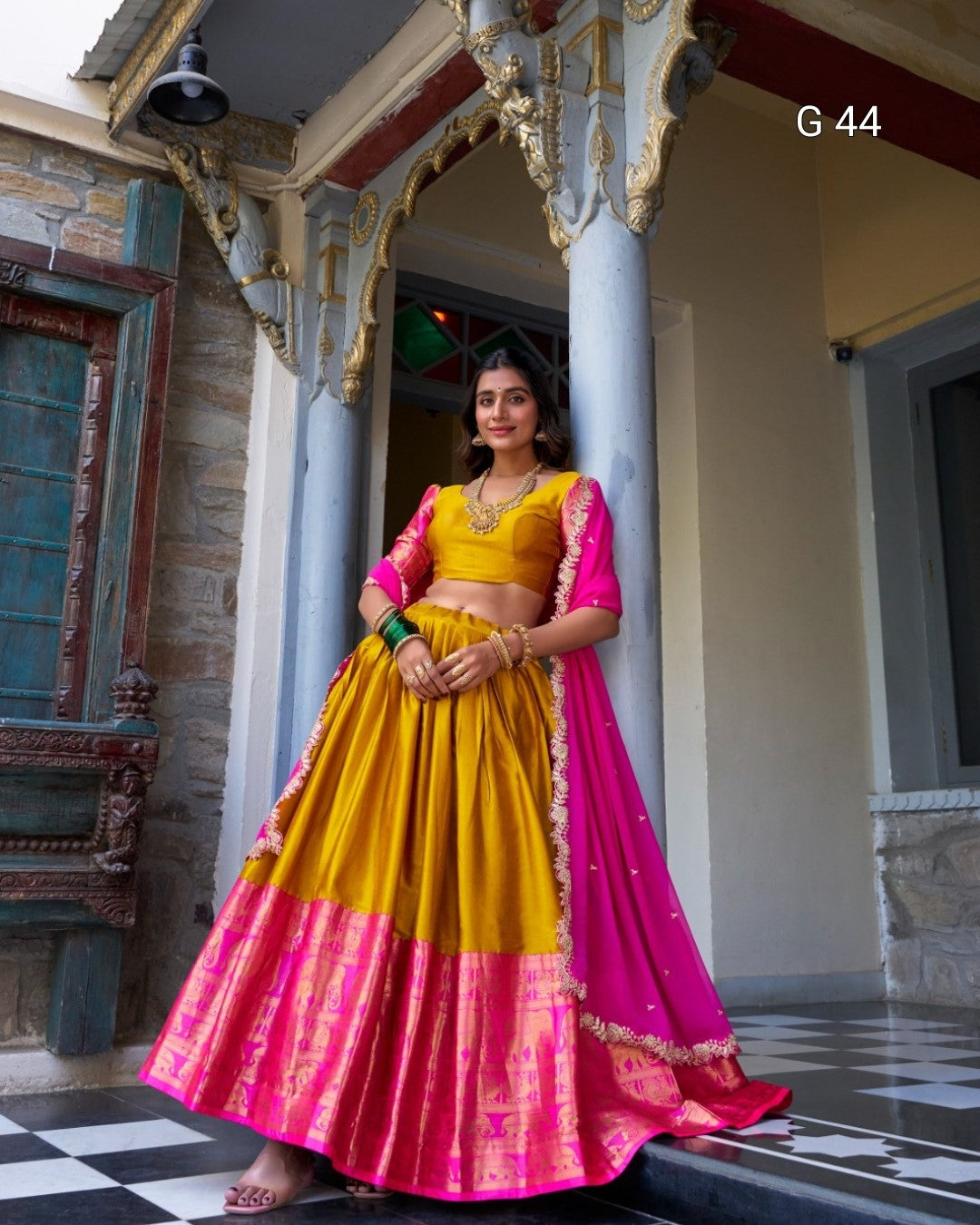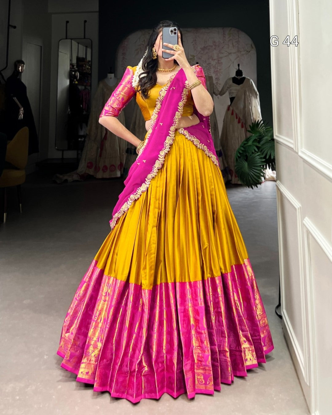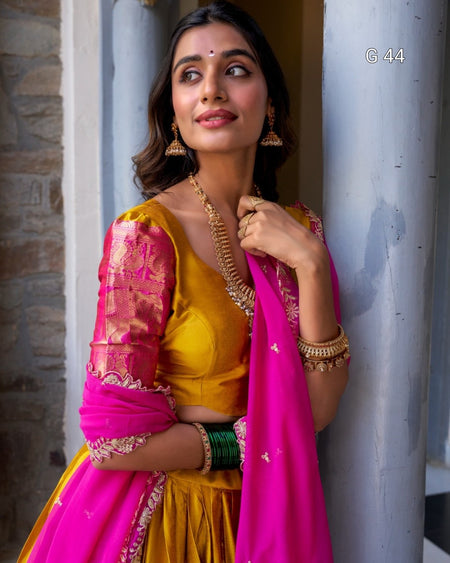 Mustard Narayan Pattu Lehenga with Zari Weaving Work – Stitched Blouse with Sequins Embroidery Dupatta - G 44 Mustred