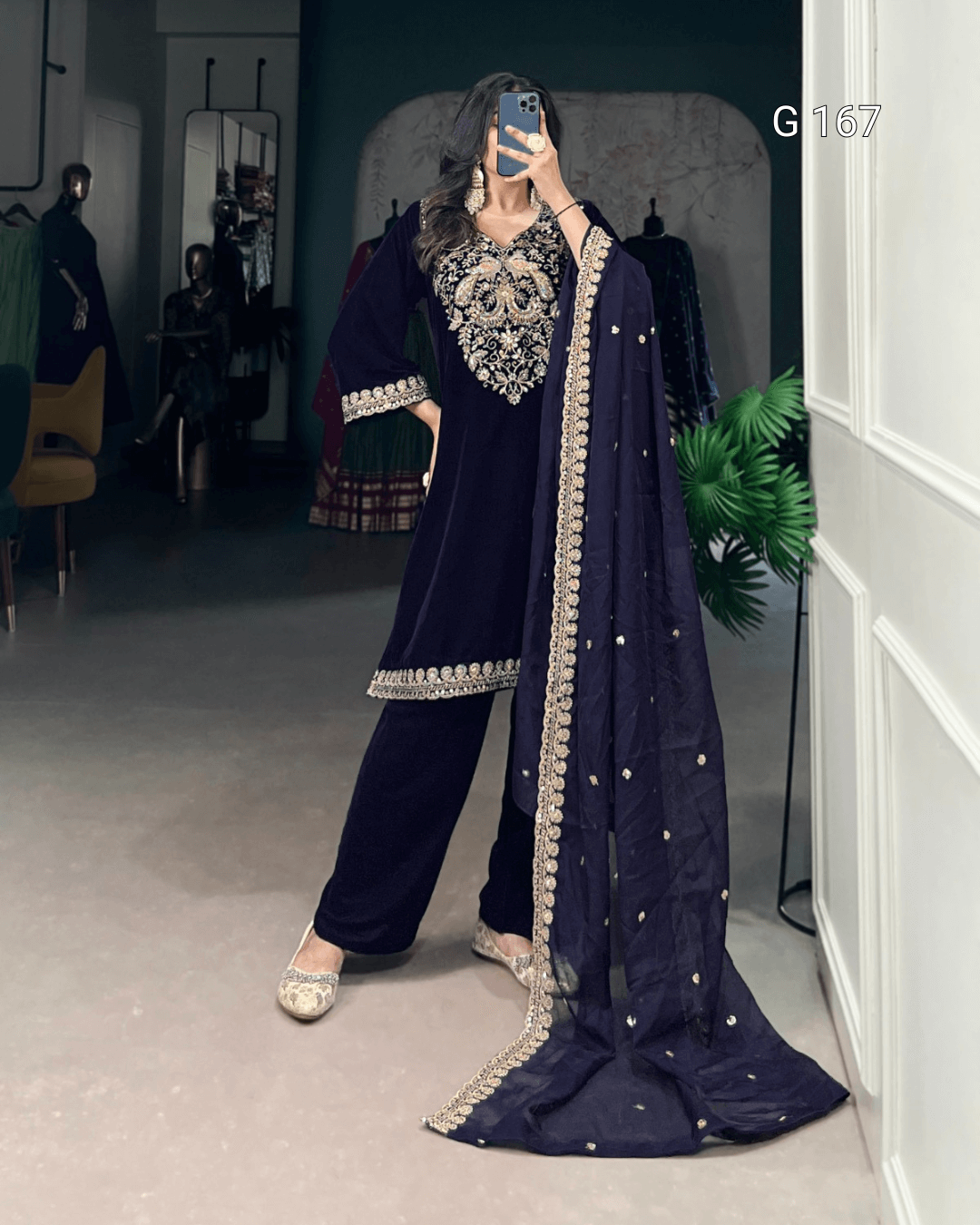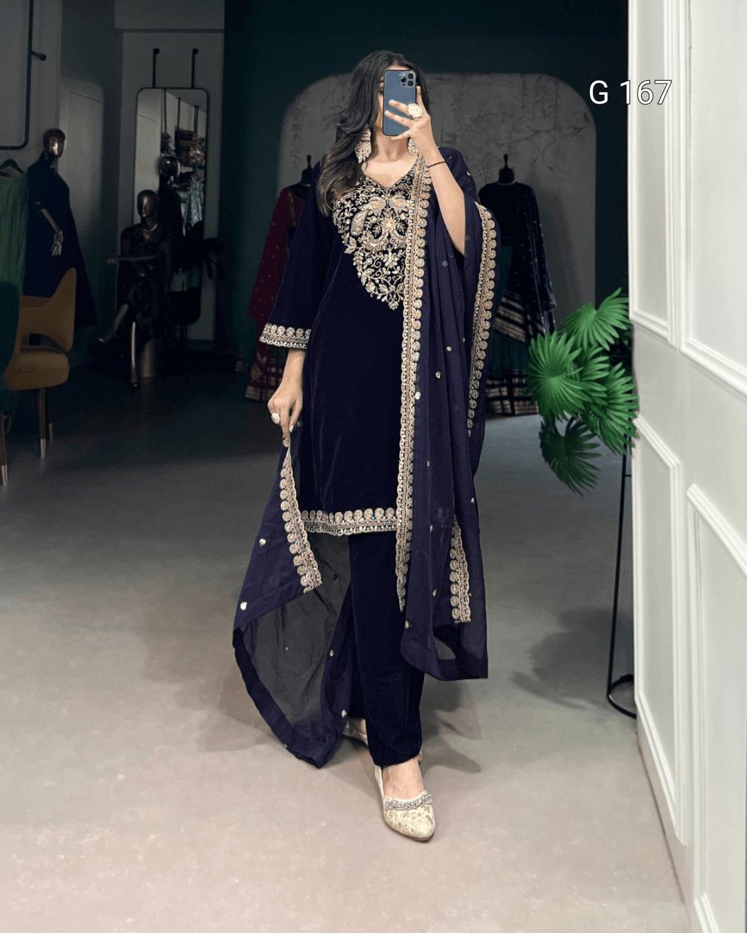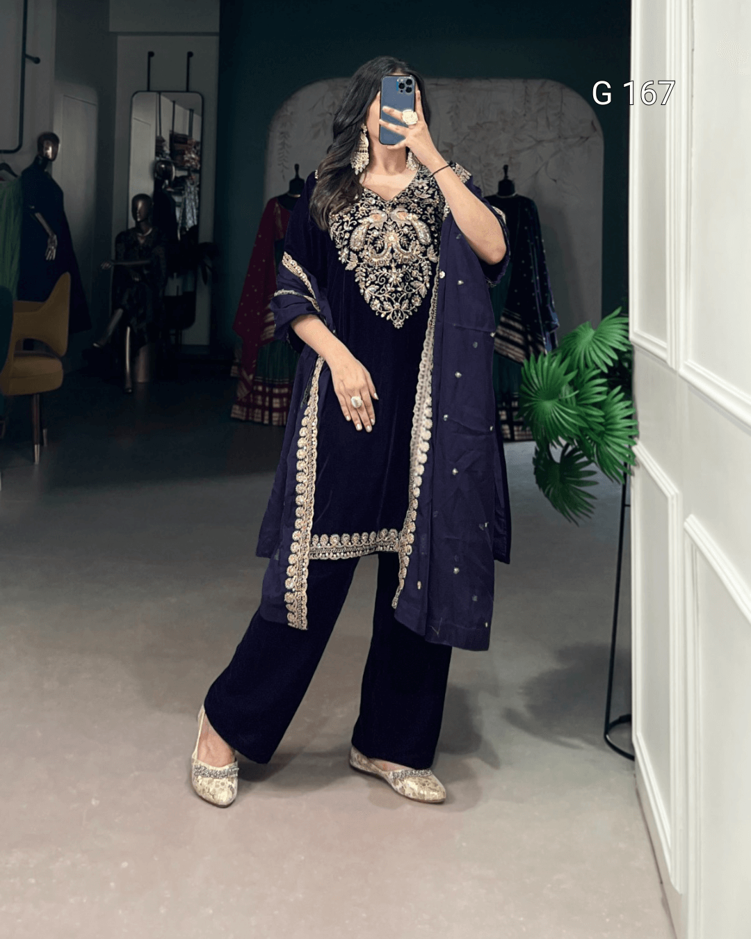 Navi Blue Velvet Top with Sequins & Thread Embroidery, Plain Velvet Bottom & Organza Dupatta - G 167 Navi Blue