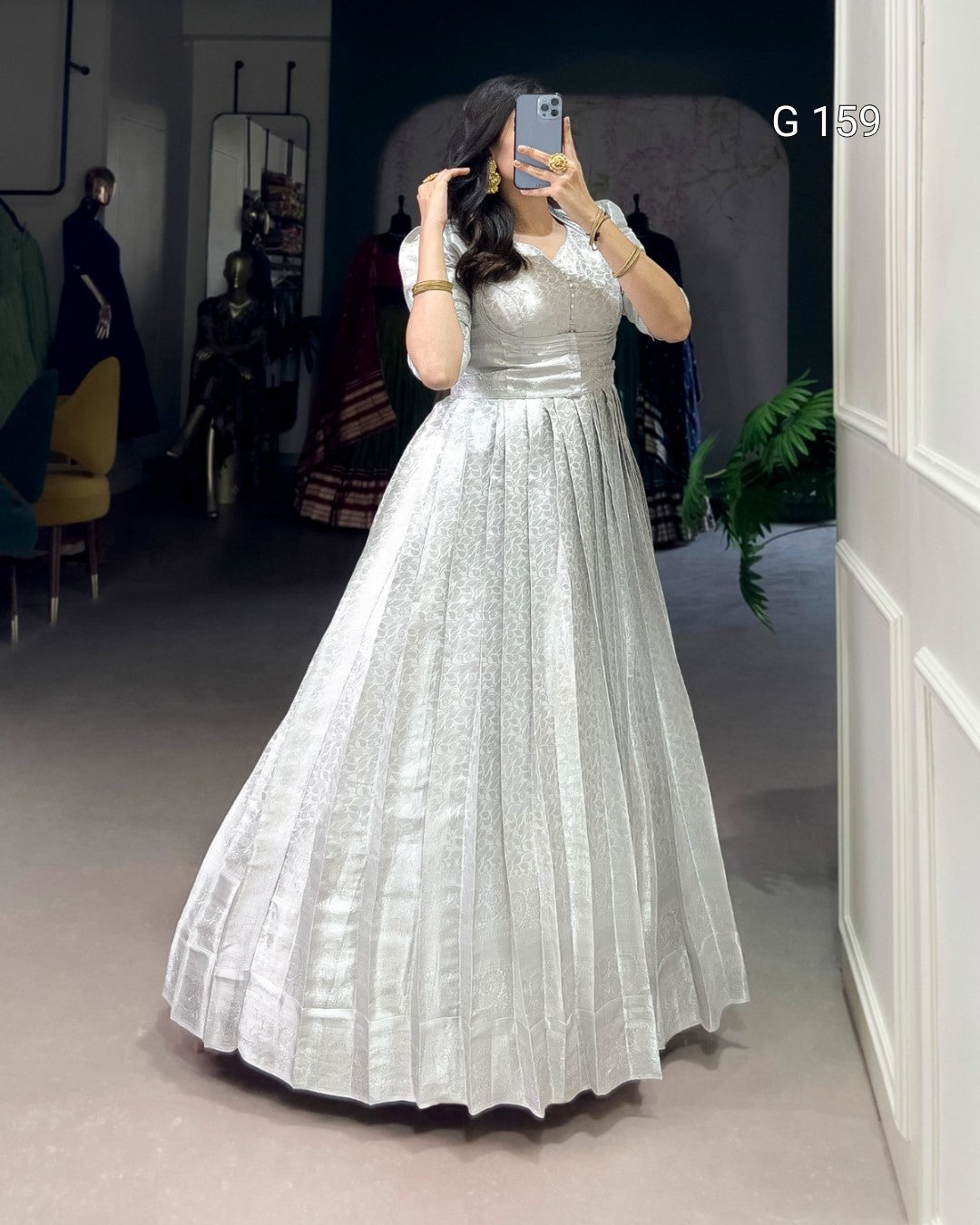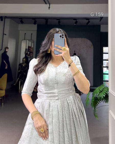 Off White Kanjivaram Gown & Koti Set with Zari Weaving & Lace Touch Up-G 159 Off White