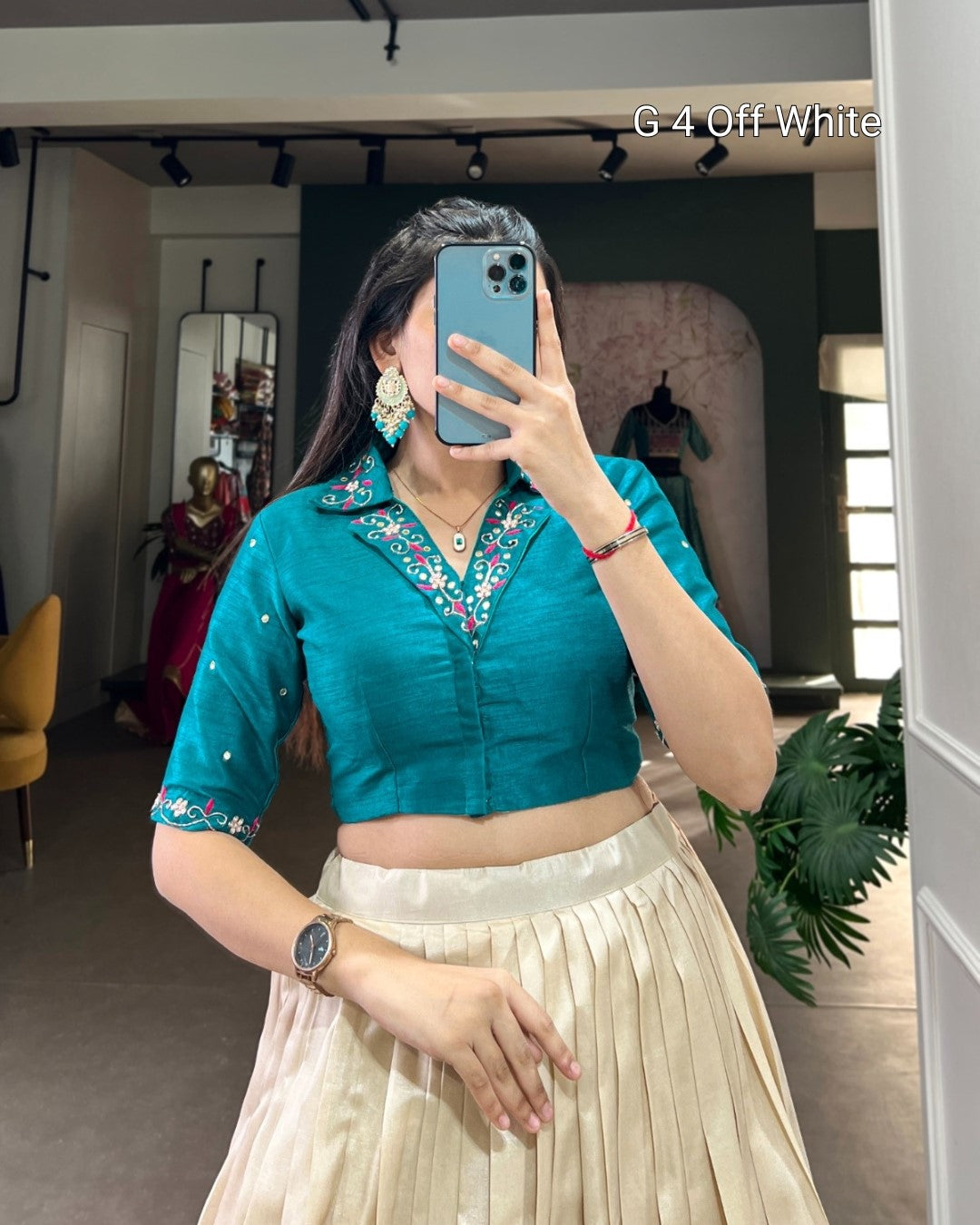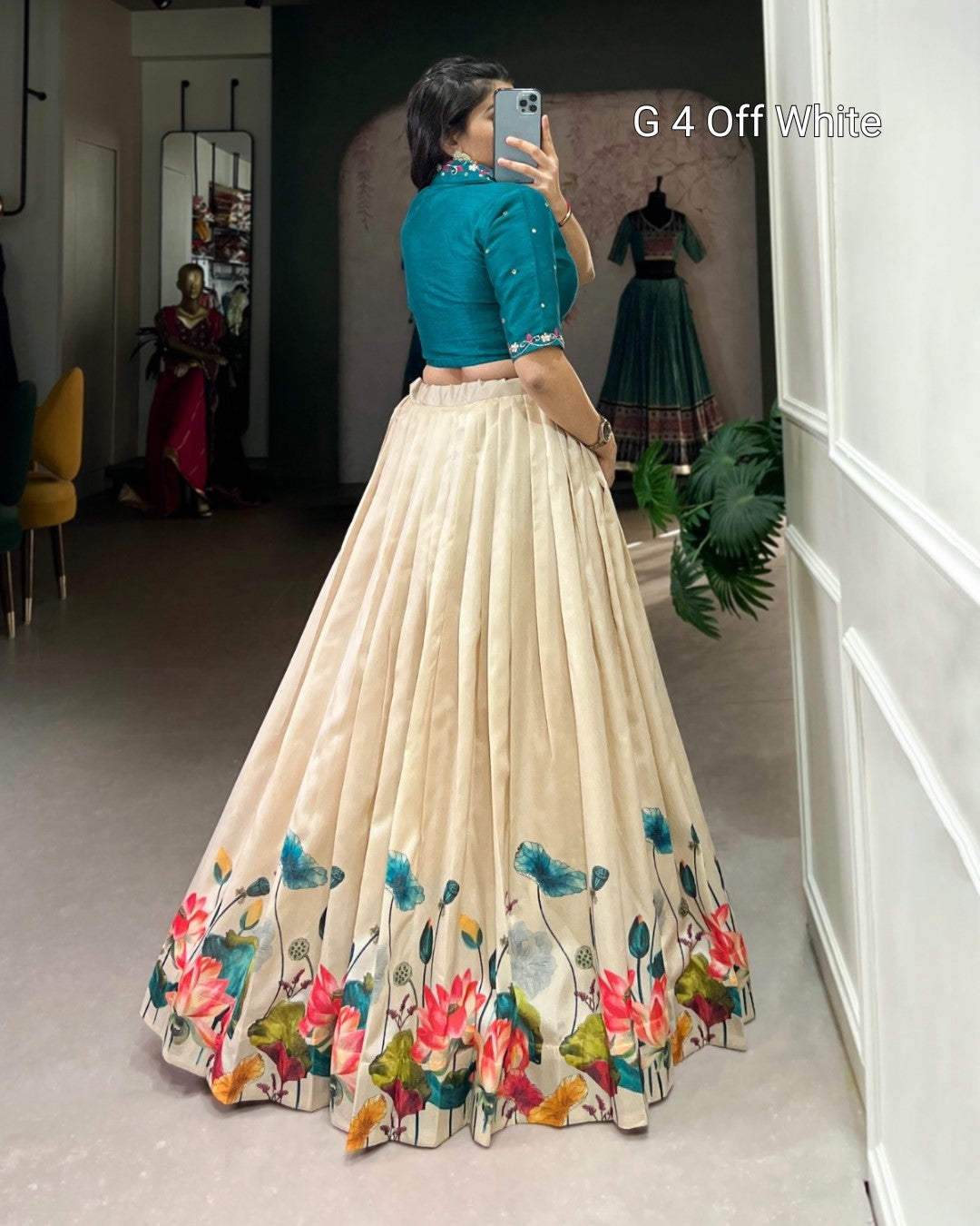 Off White Tussar Silk Floral Lehenga with Mirror Work Blouse – G 4 Off White
