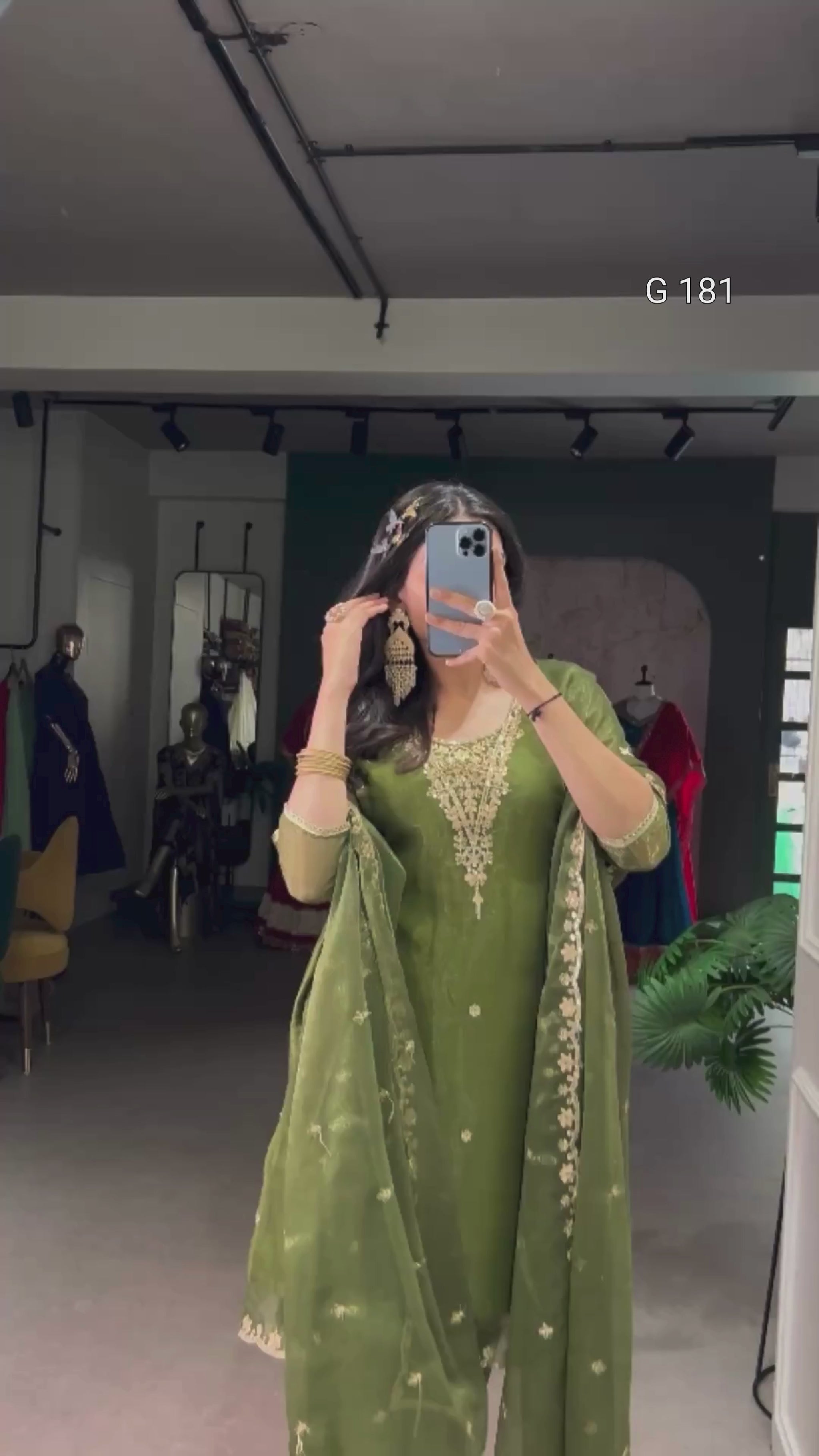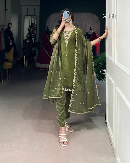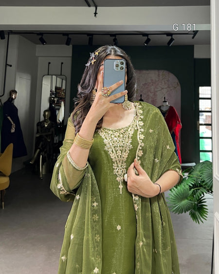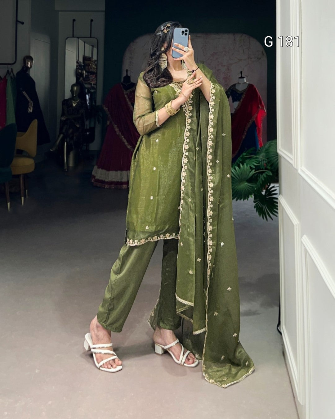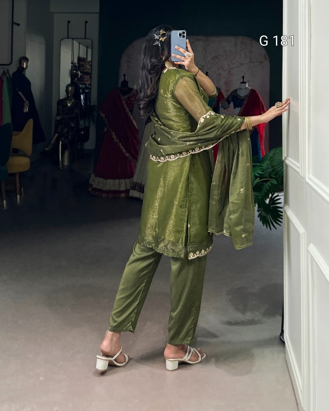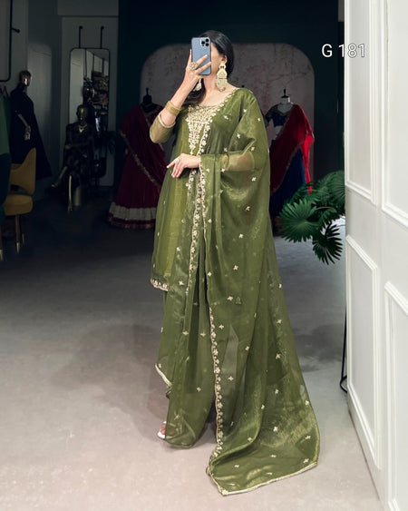 Olive Green Gold Coin Top with Sequins Embroidery & Maska Cotton Bottom – G 181 Olive Green