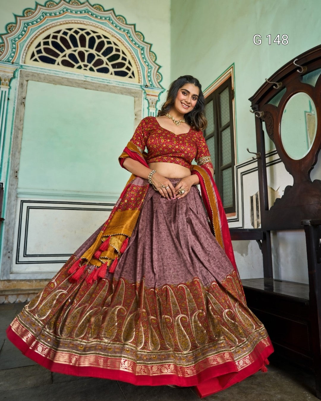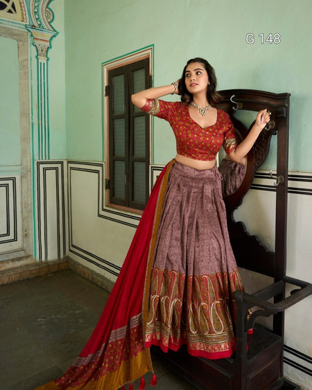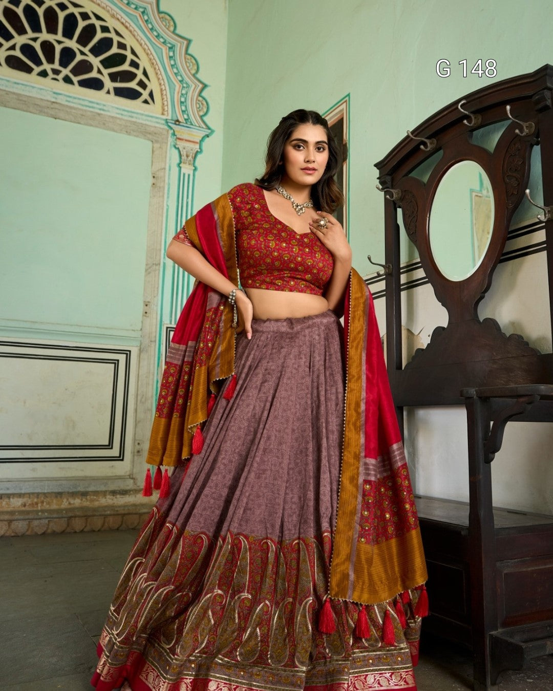 Onion Tussar Silk Lehenga with Kashmiri Print & Foil Work – Wedding Lehenga Set-G 148 Onion