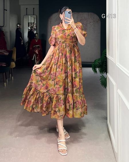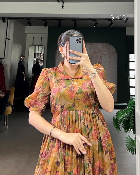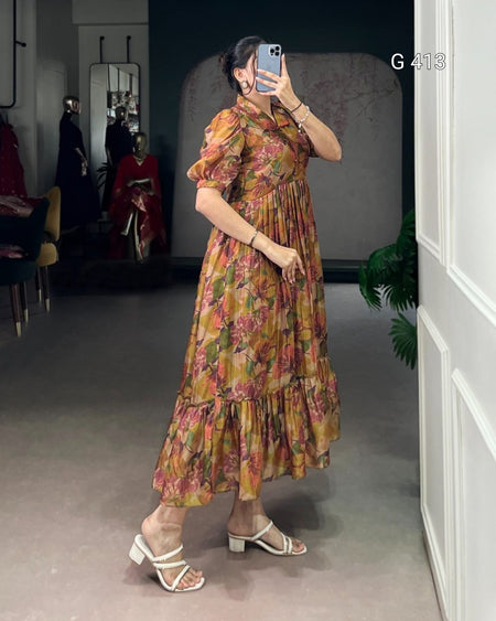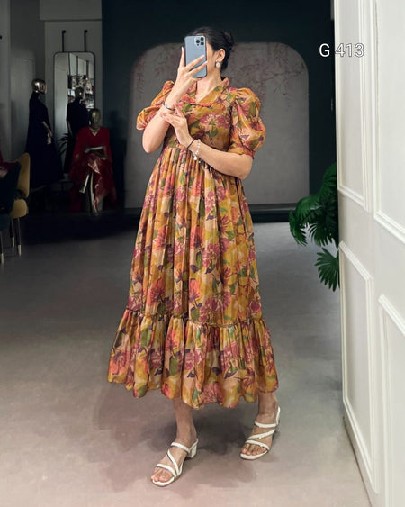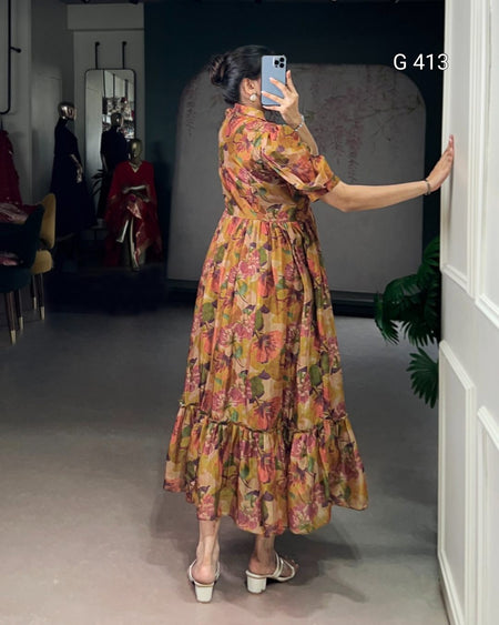 Organza Floral Printed Frock with Micro Crepe Lining – G 413 Brown