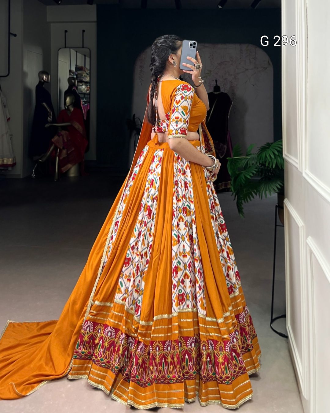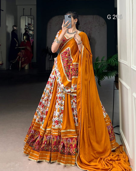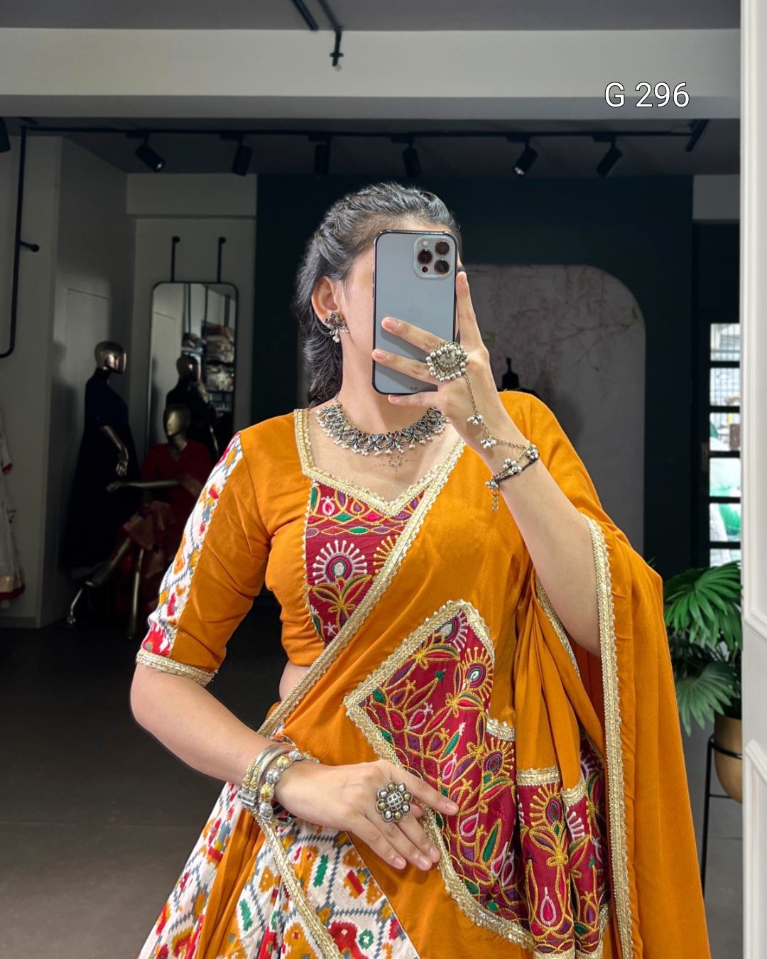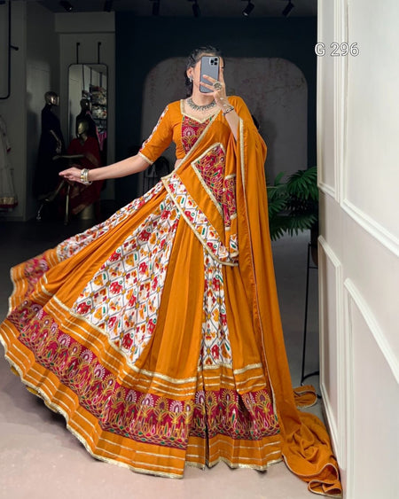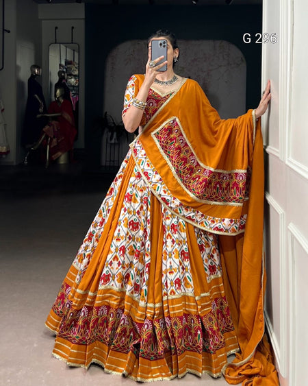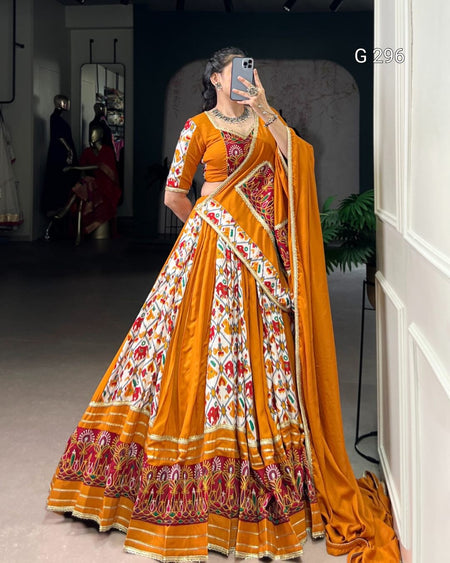 Patola Print Rayon Lehenga with Gamthi Work & Lace Touch Up – G 296 Mustard