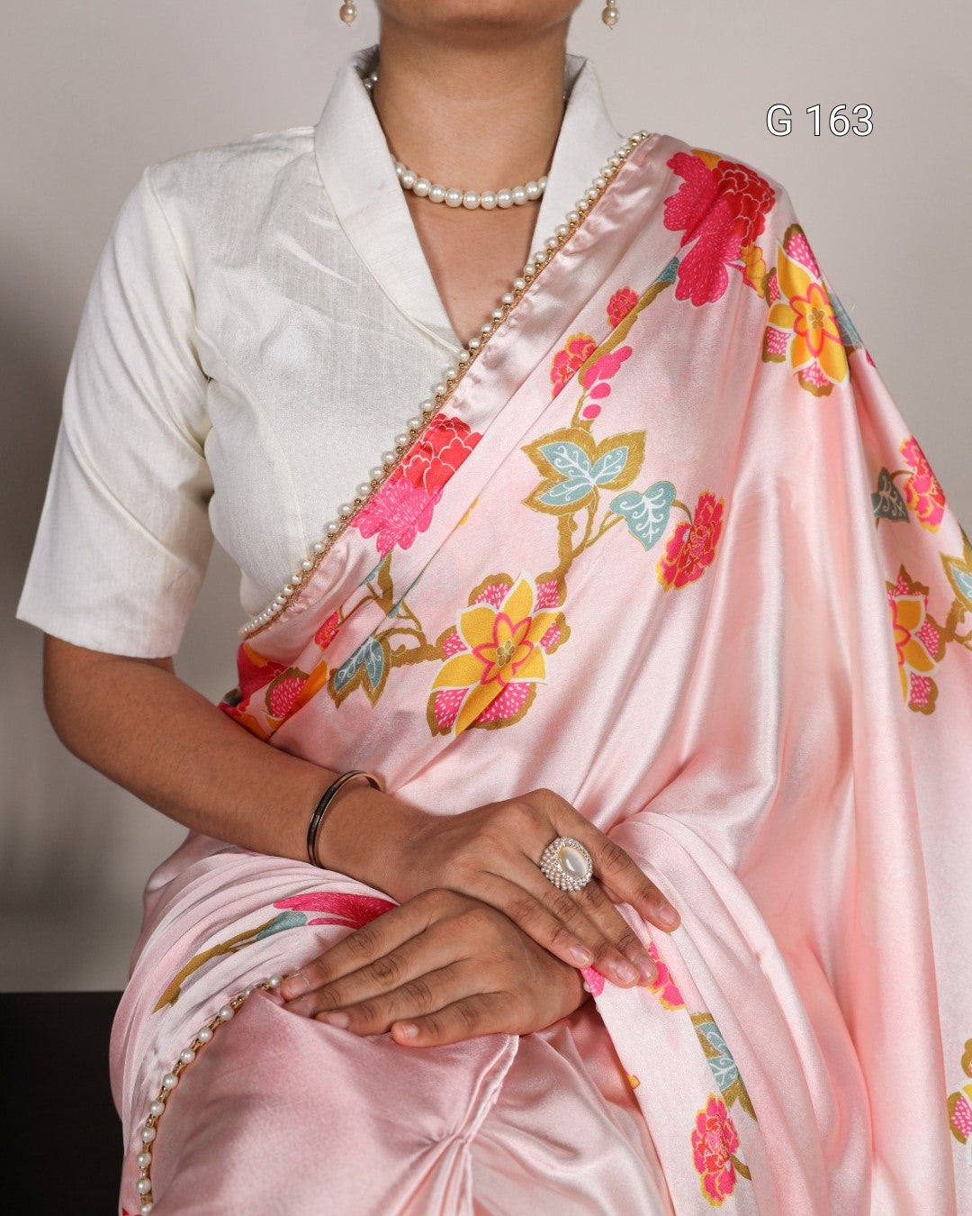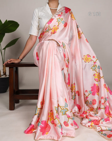 Peach Satin Silk Saree with Floral Print & Pearl Lace Border-G 163 Peach