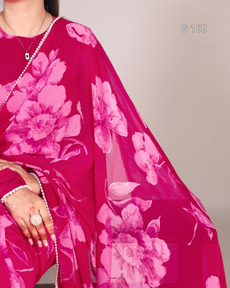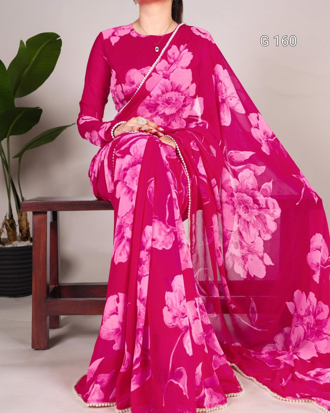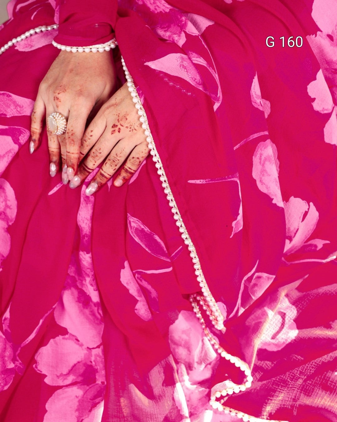 Pink Chiffon Saree with Floral Print & Pearl Lace Border-G 160 Pink