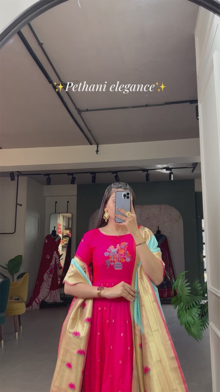 Pink Jacquard Silk Gown with Zari Weaving Work – Stitched Gown and Dupatta with Tassels