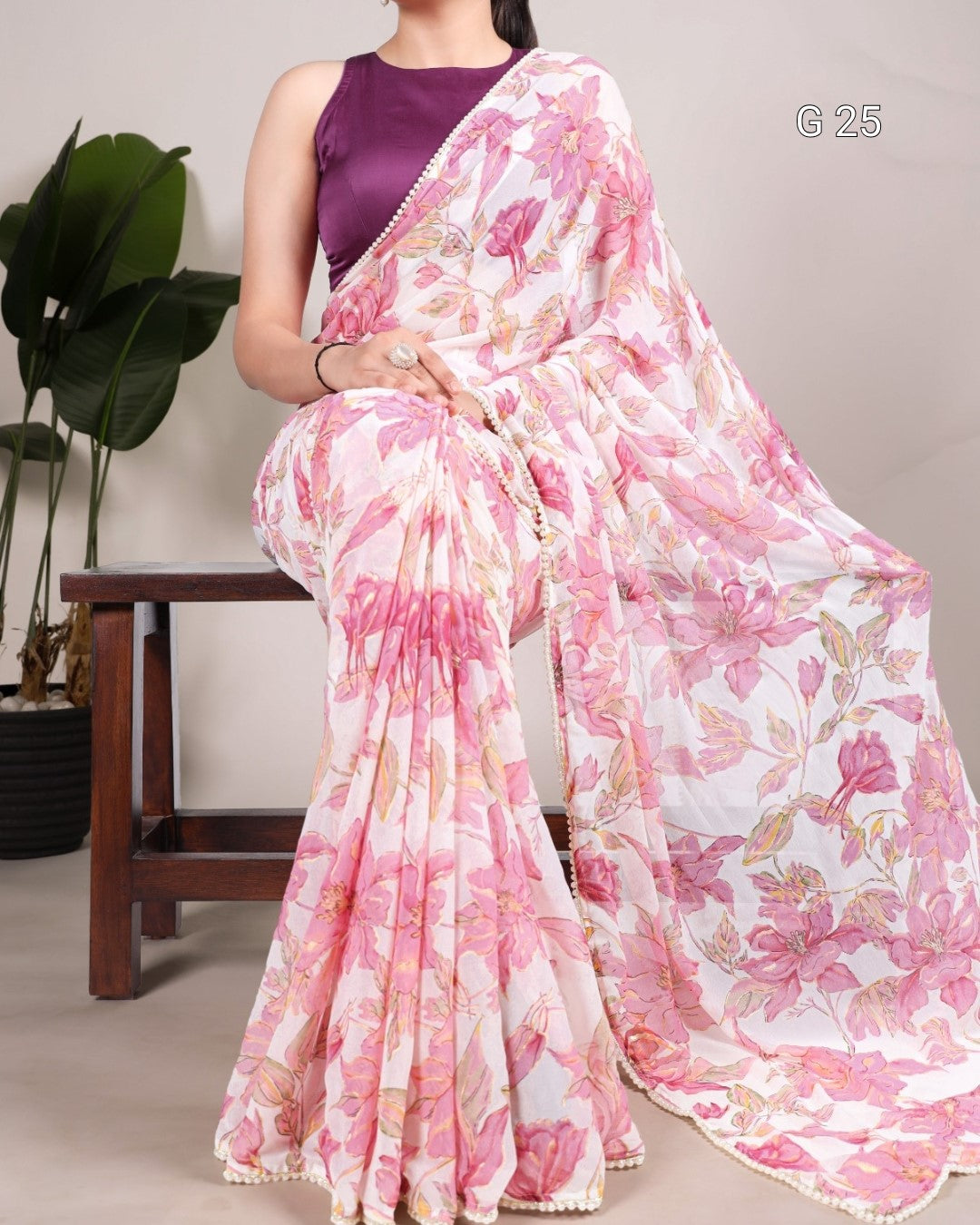 Pink Weightless Marbal Saree with Floral Print & Pearl Lace Border – G 25 Pink