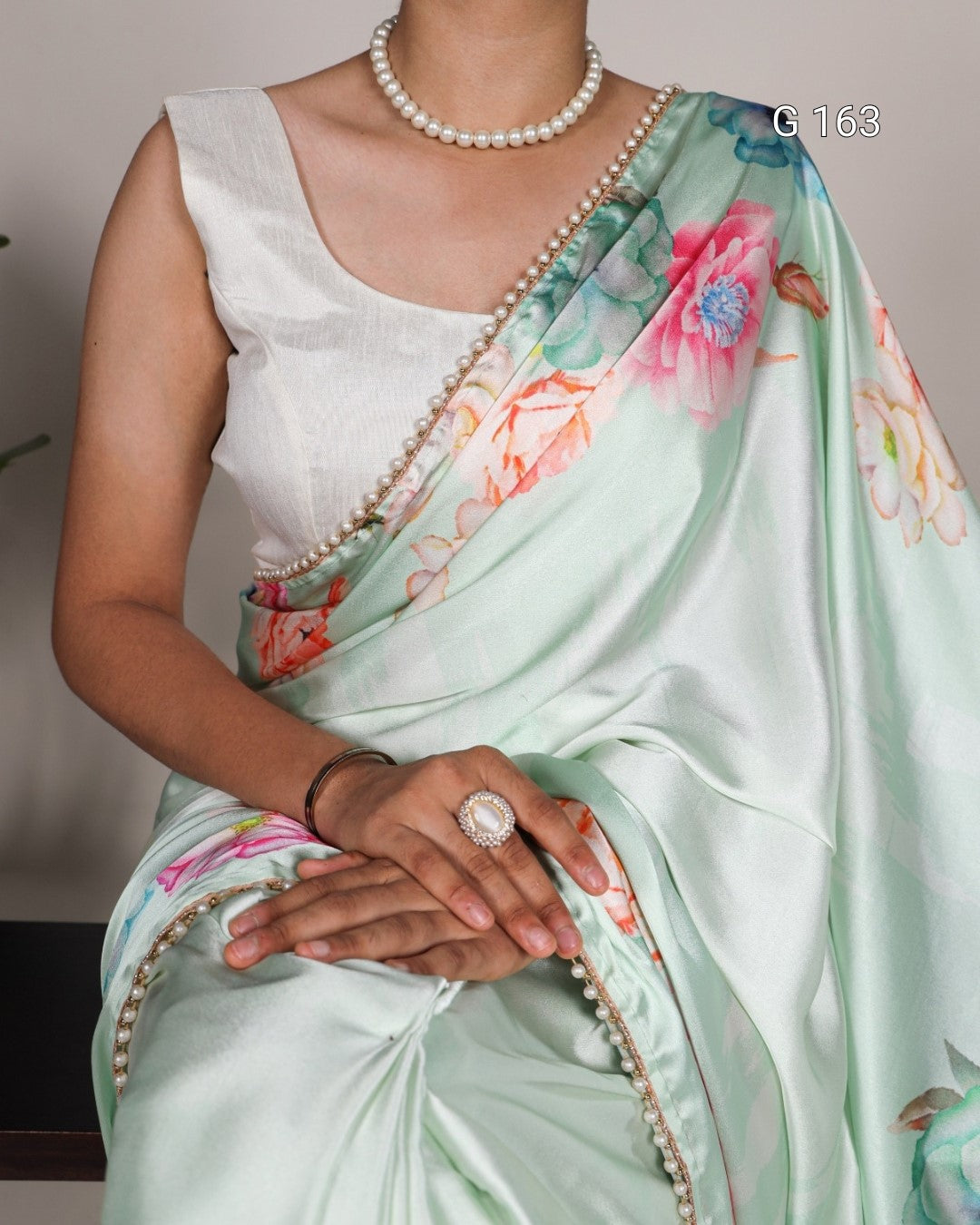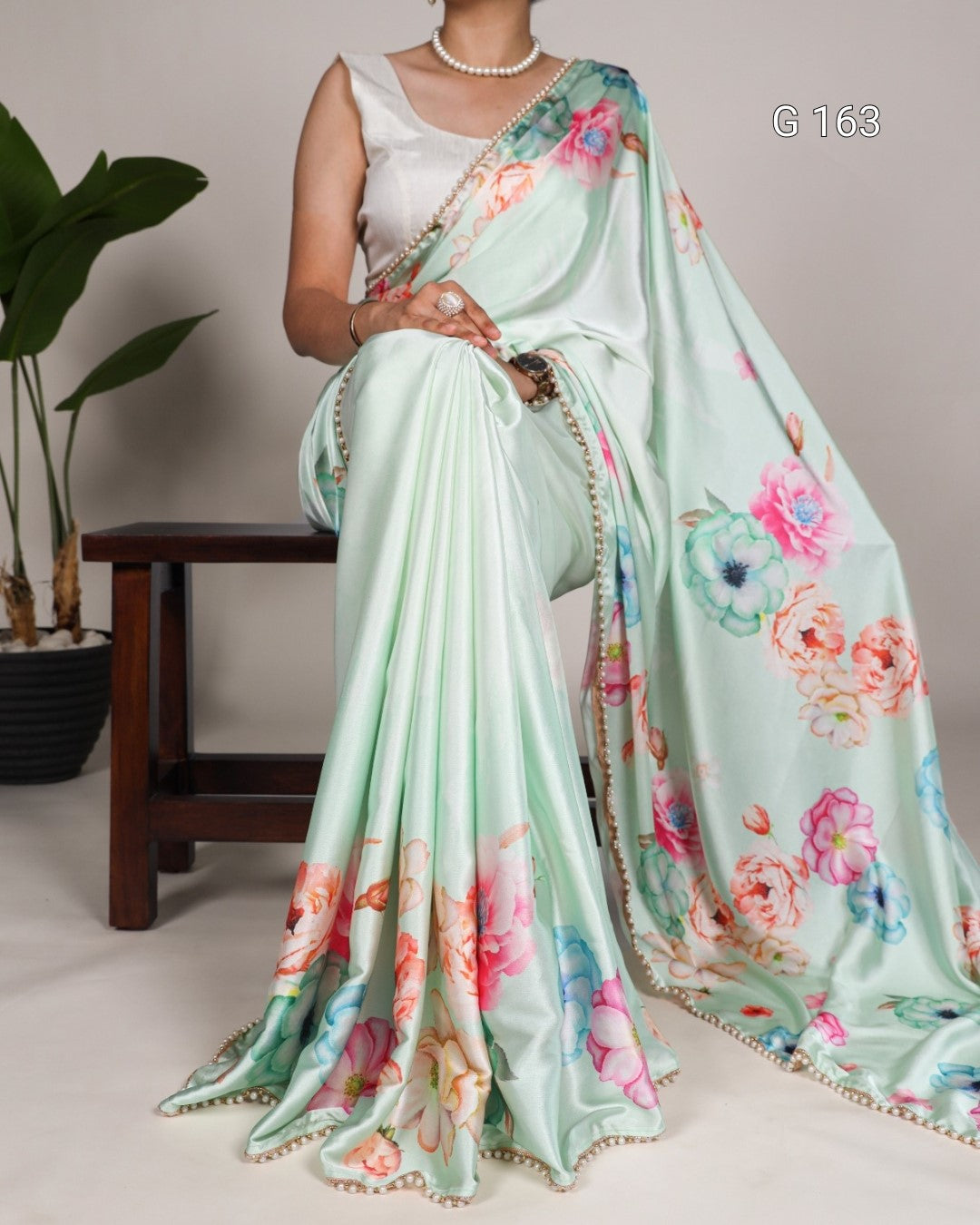 Pista Satin Silk Saree with Floral Print & Pearl Lace Border-G 163 Pista
