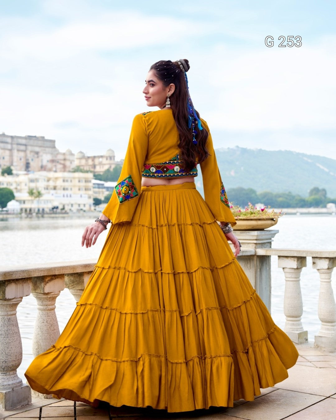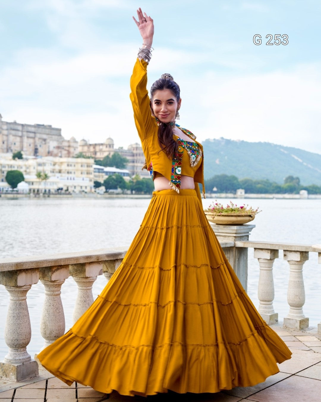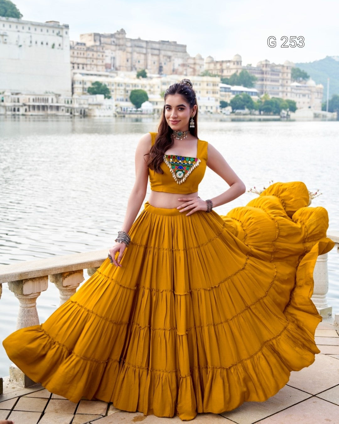 Plain Pure Rayon Lehenga with Original Mirror Gamthi Work – G 253 Mustard