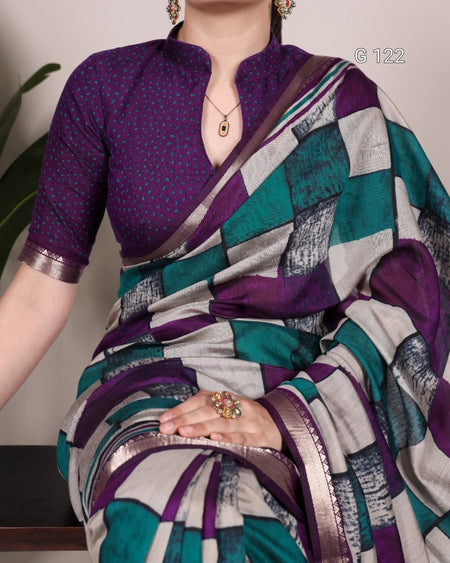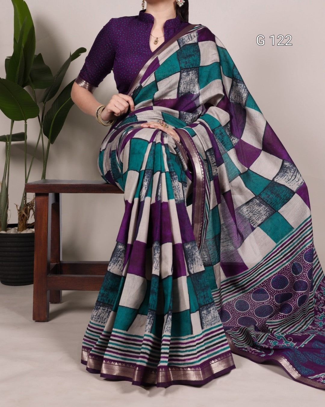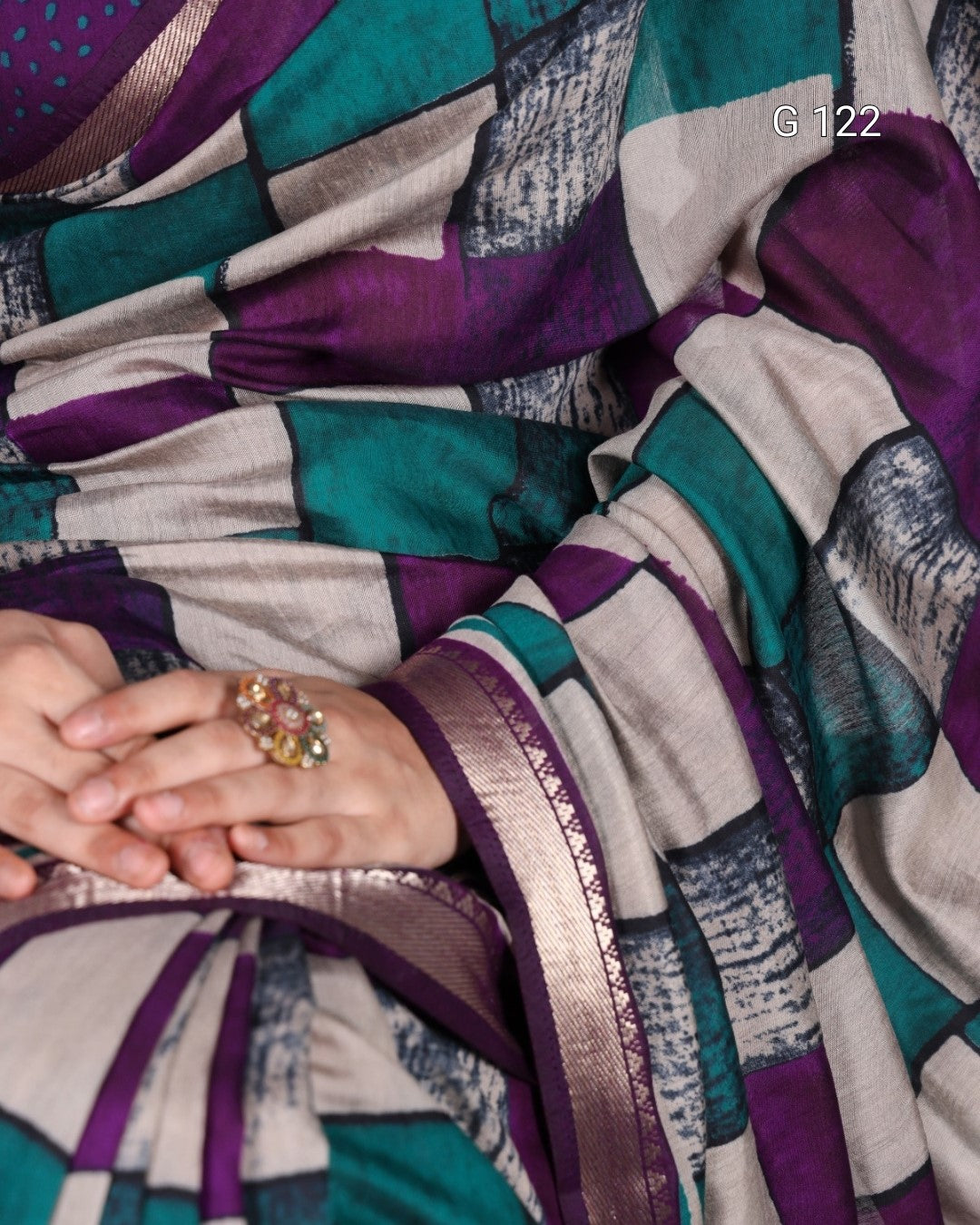 Printed Polyester Viscose Chanderi Saree with Temple Border – G 122 Purple