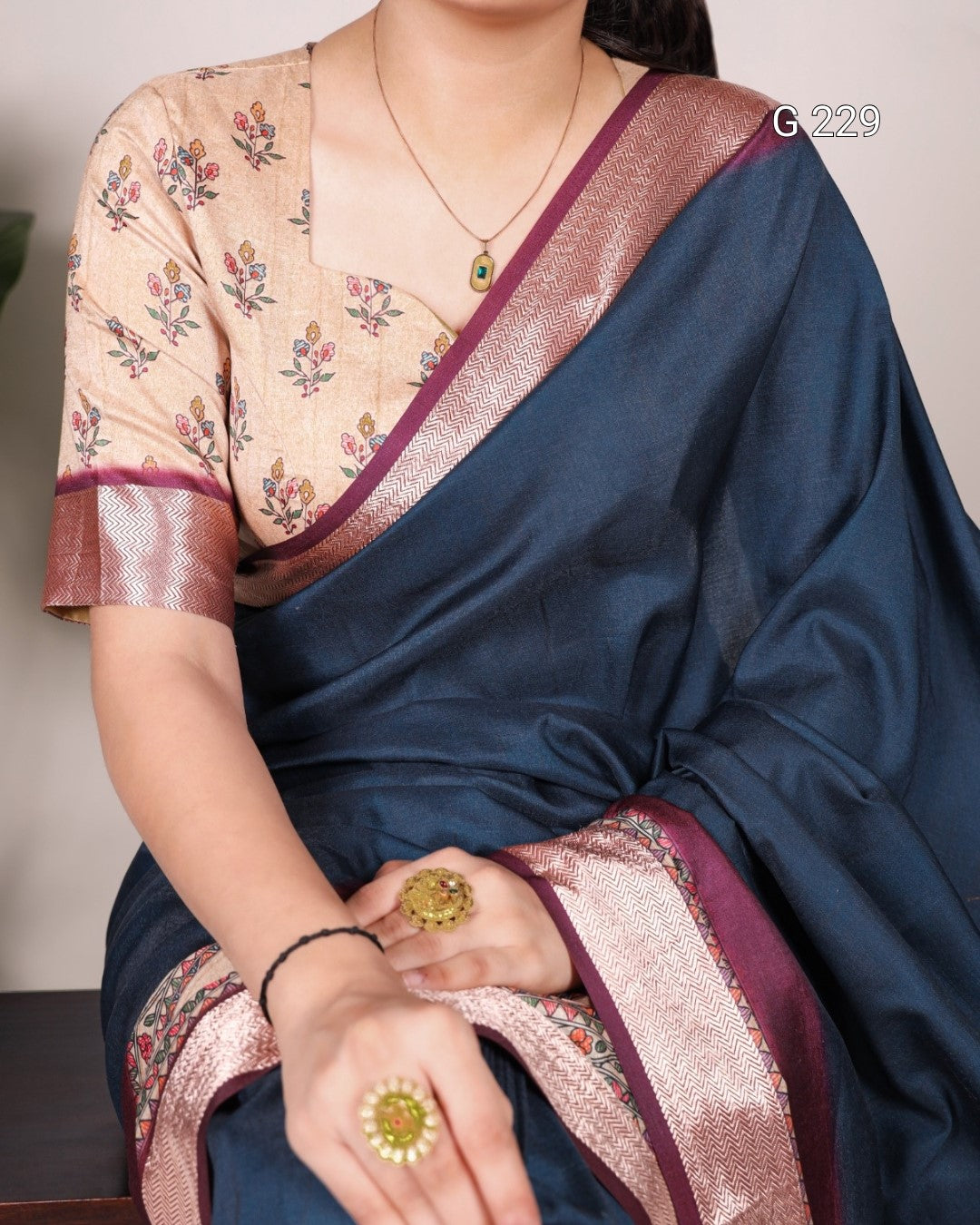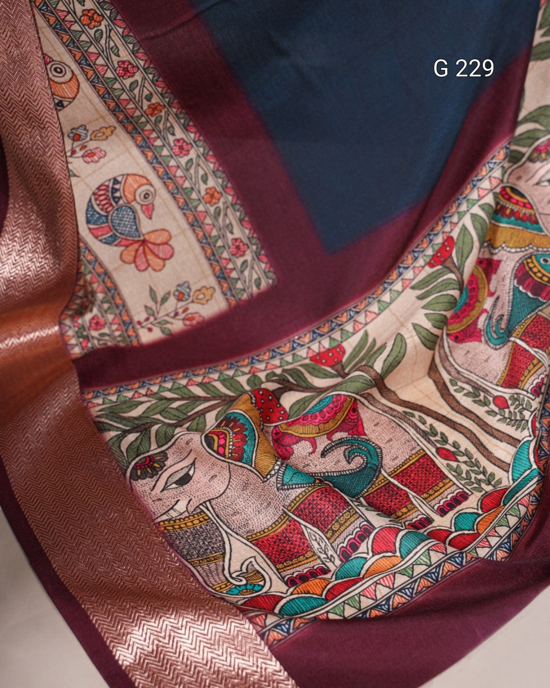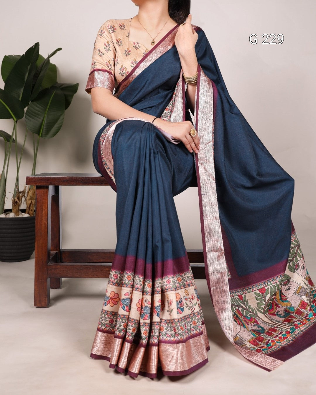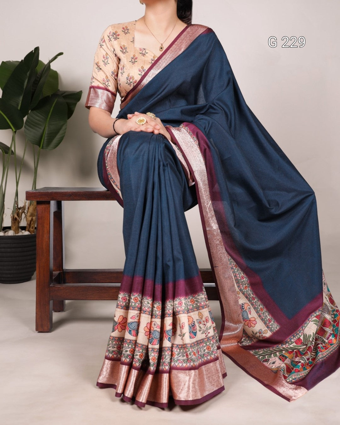 Printed Tussar Silk Saree with Viscose Border – G 229 Popnil Blue