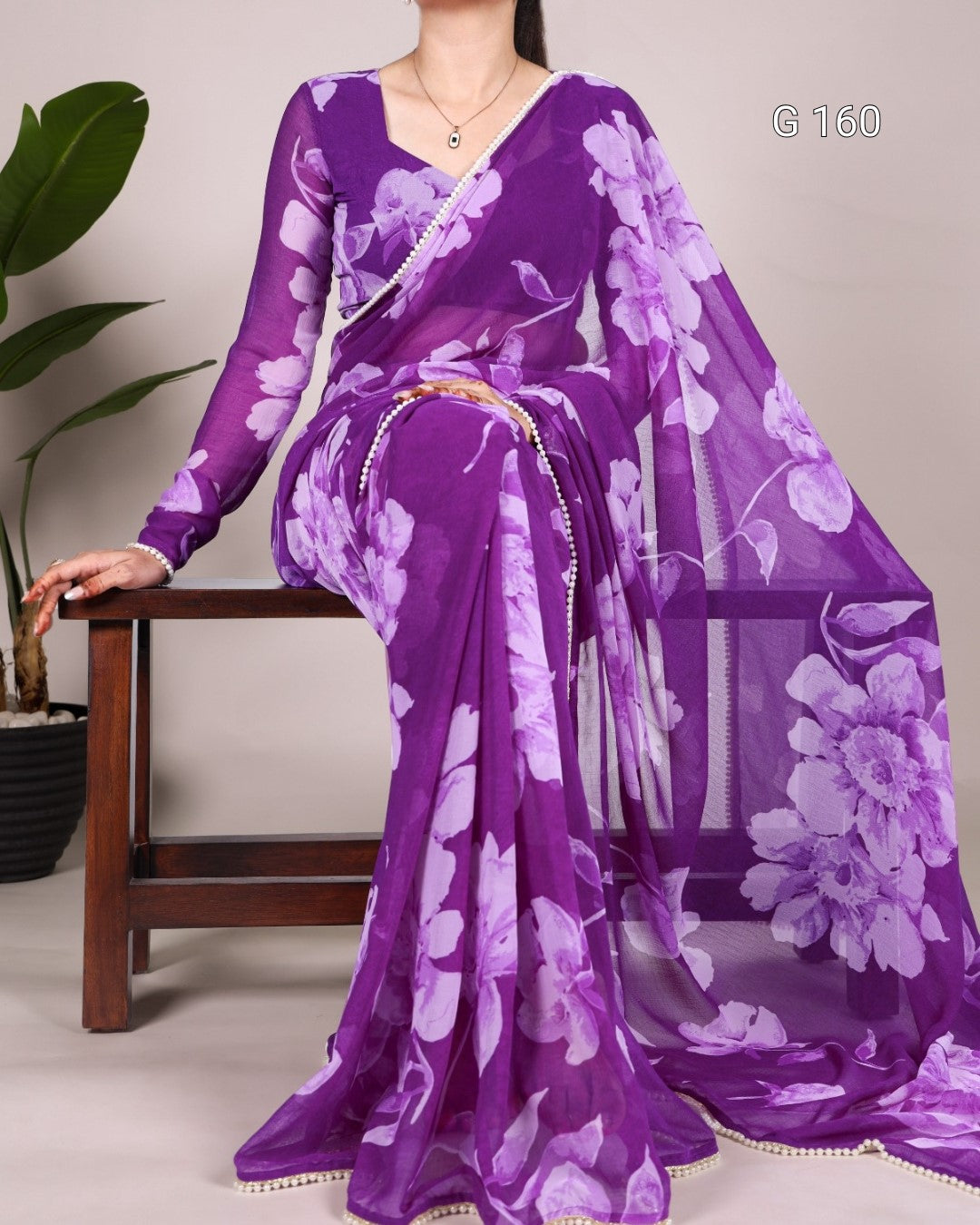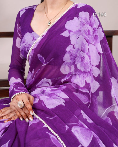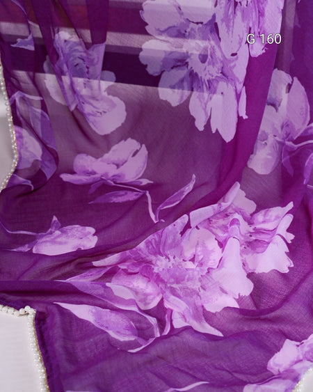 Purple Chiffon Saree with Floral Print & Pearl Lace Border-G 160 Purple