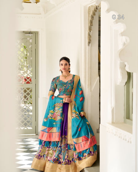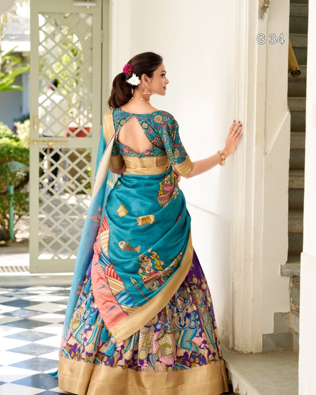 Purple Dola Silk Lehenga with Kalamkari Print & Weaving Border – G 34 Purple