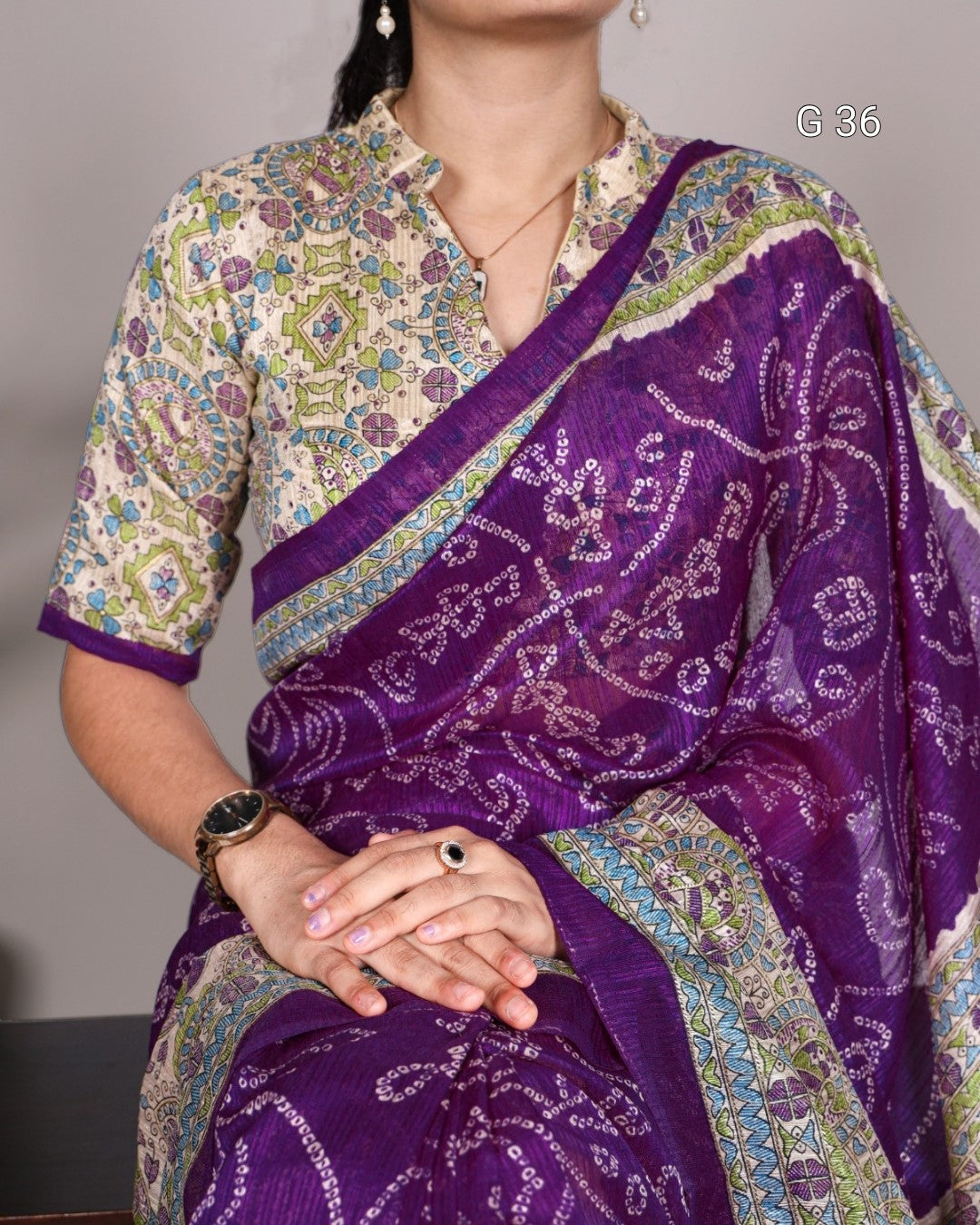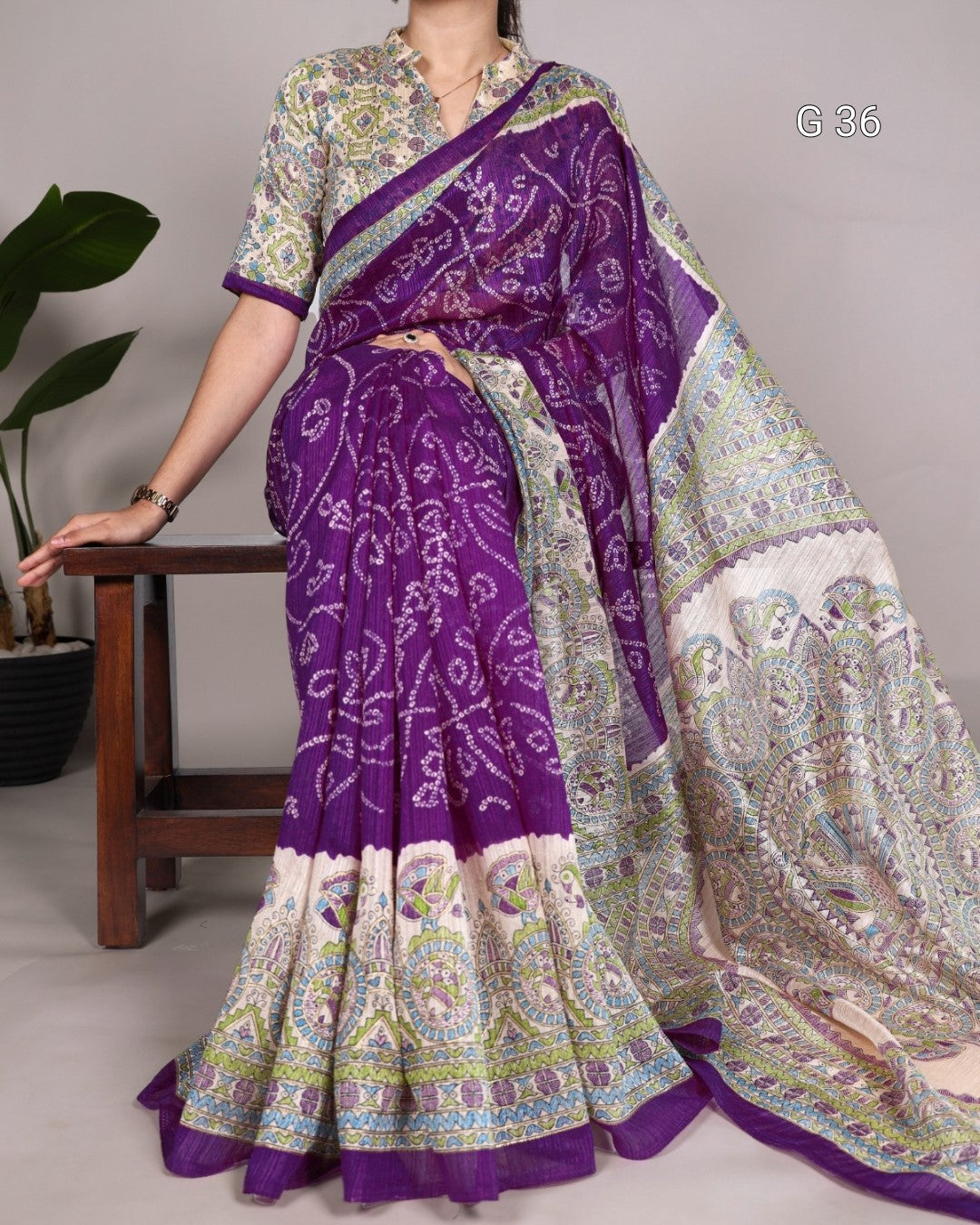 Purple Silk Saree with Madhubani & Bandhej Fusion Print – G 36 Purple