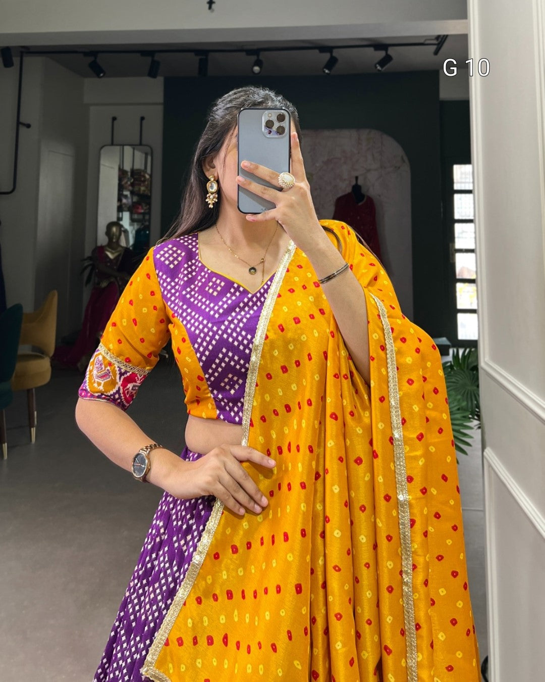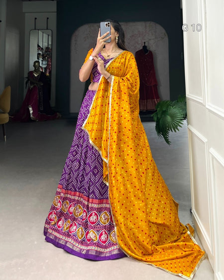 Purple Tasar Silk Lehenga with Bandhej and Patola Print – Foil Work, Stitched Blouse, and Dola Silk Dupatta - G 10 Purple