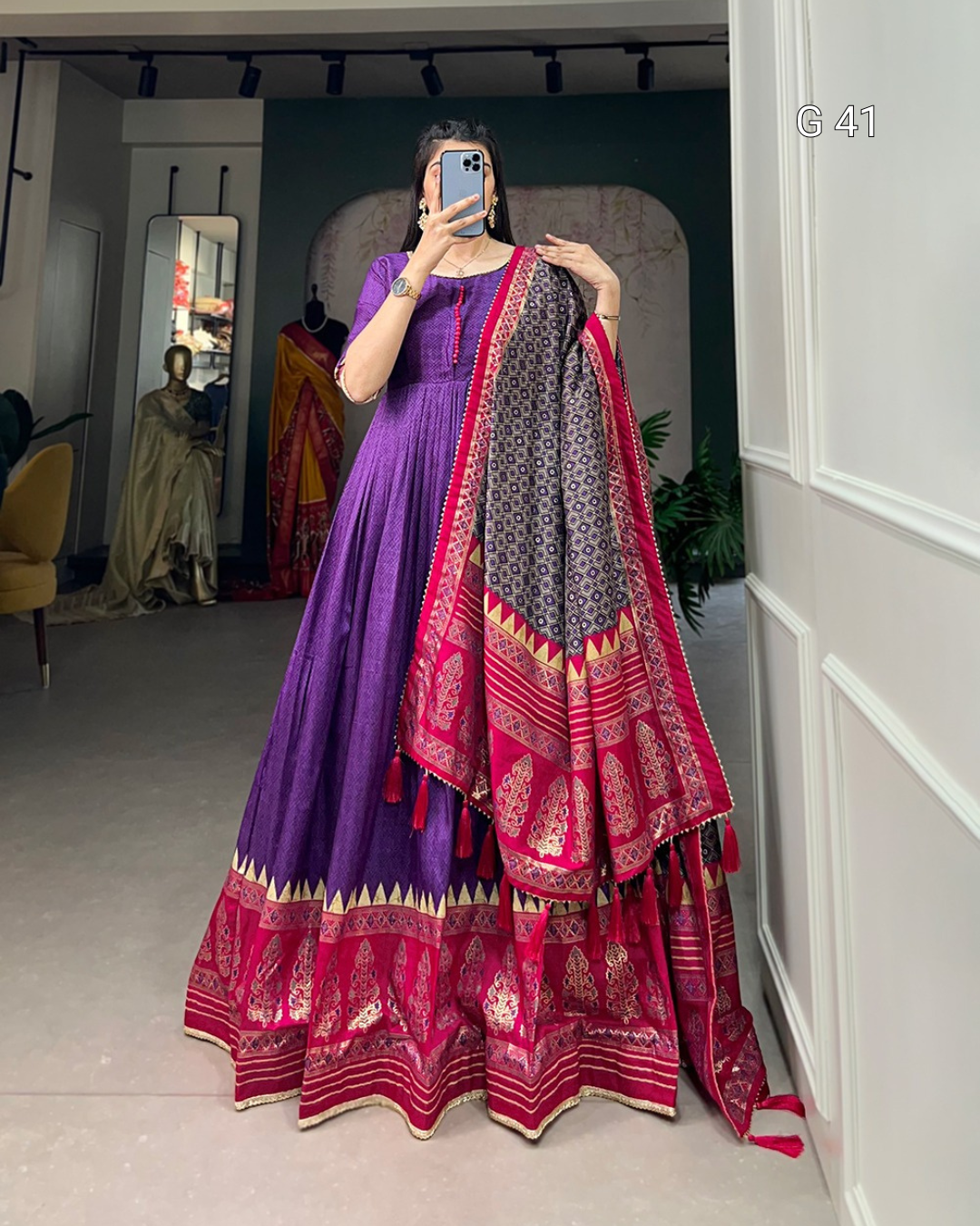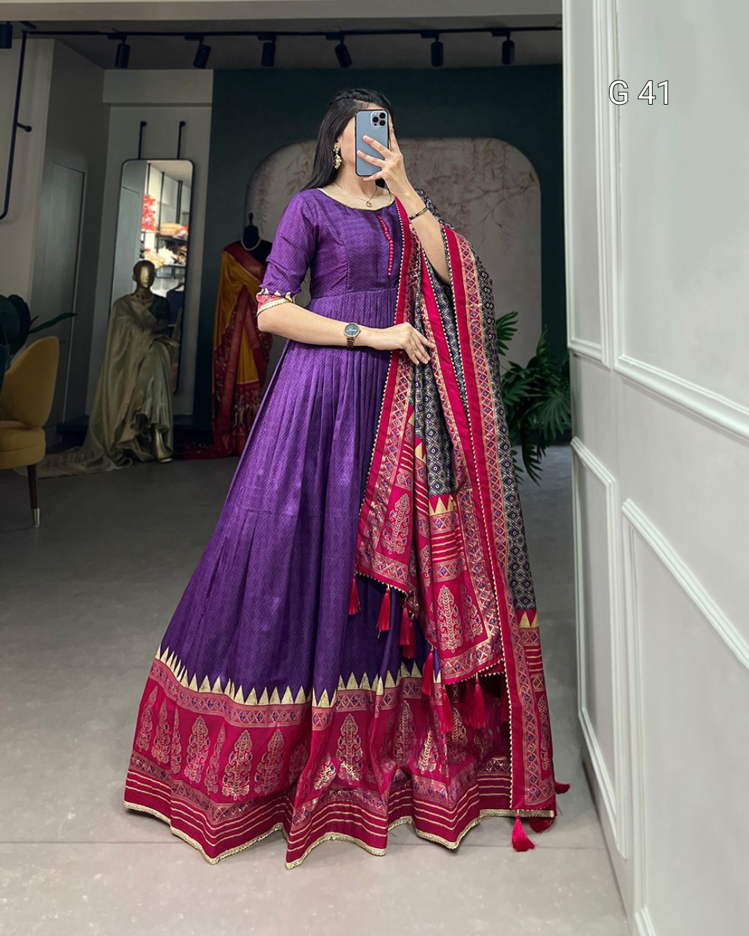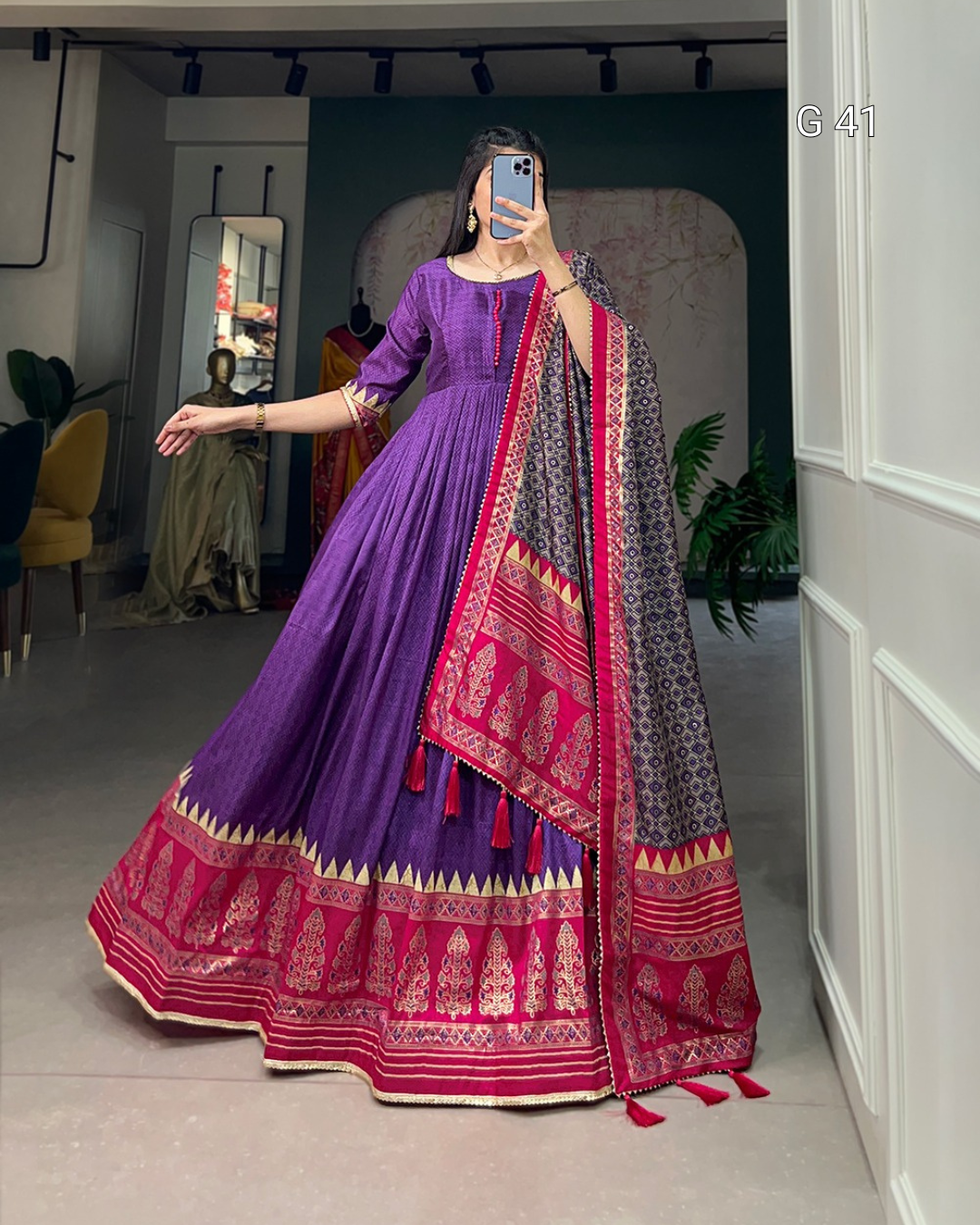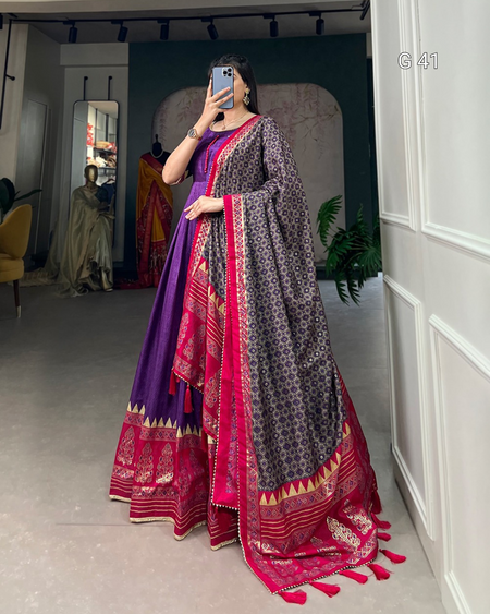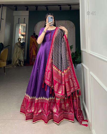 Purple Tussar Silk Gown with Print & Foil Work – Stitched Gown with Gotta Patti Lace Border Dupatta - G 41 Purple