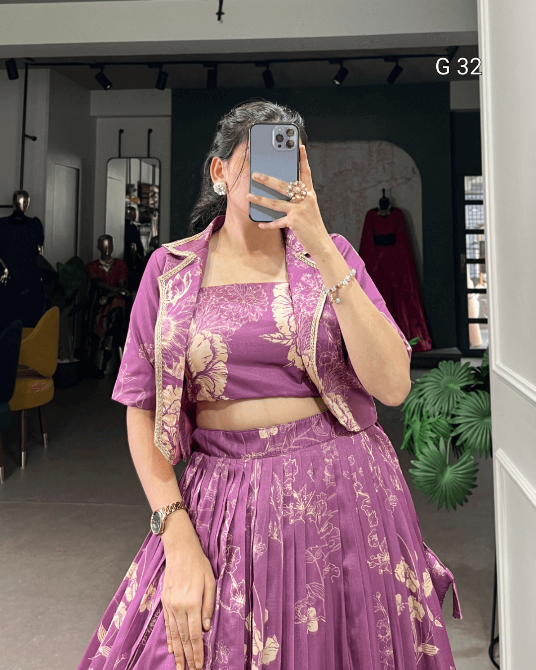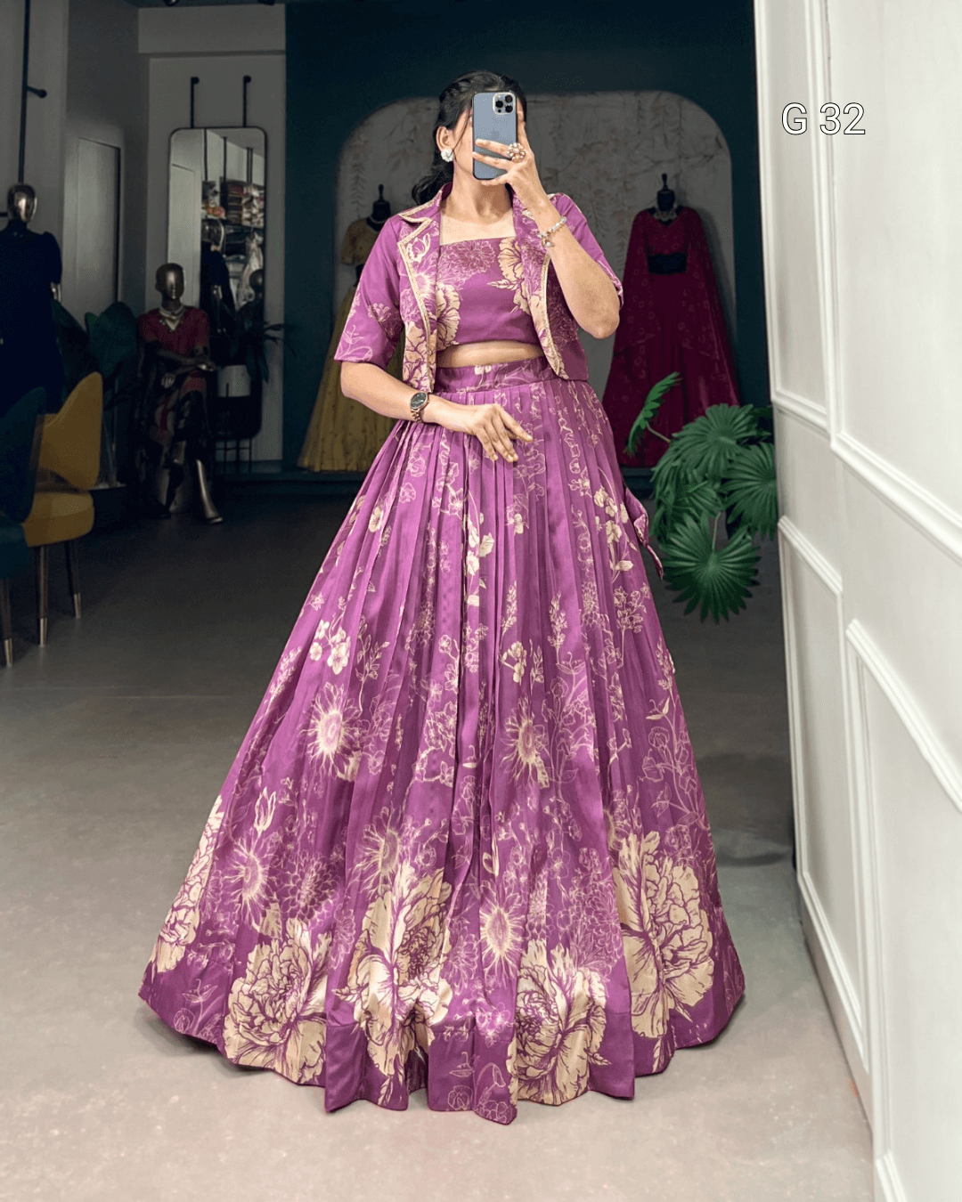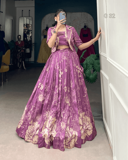 Purple Tussar Silk Lehenga with Floral Print – G 32 Purple