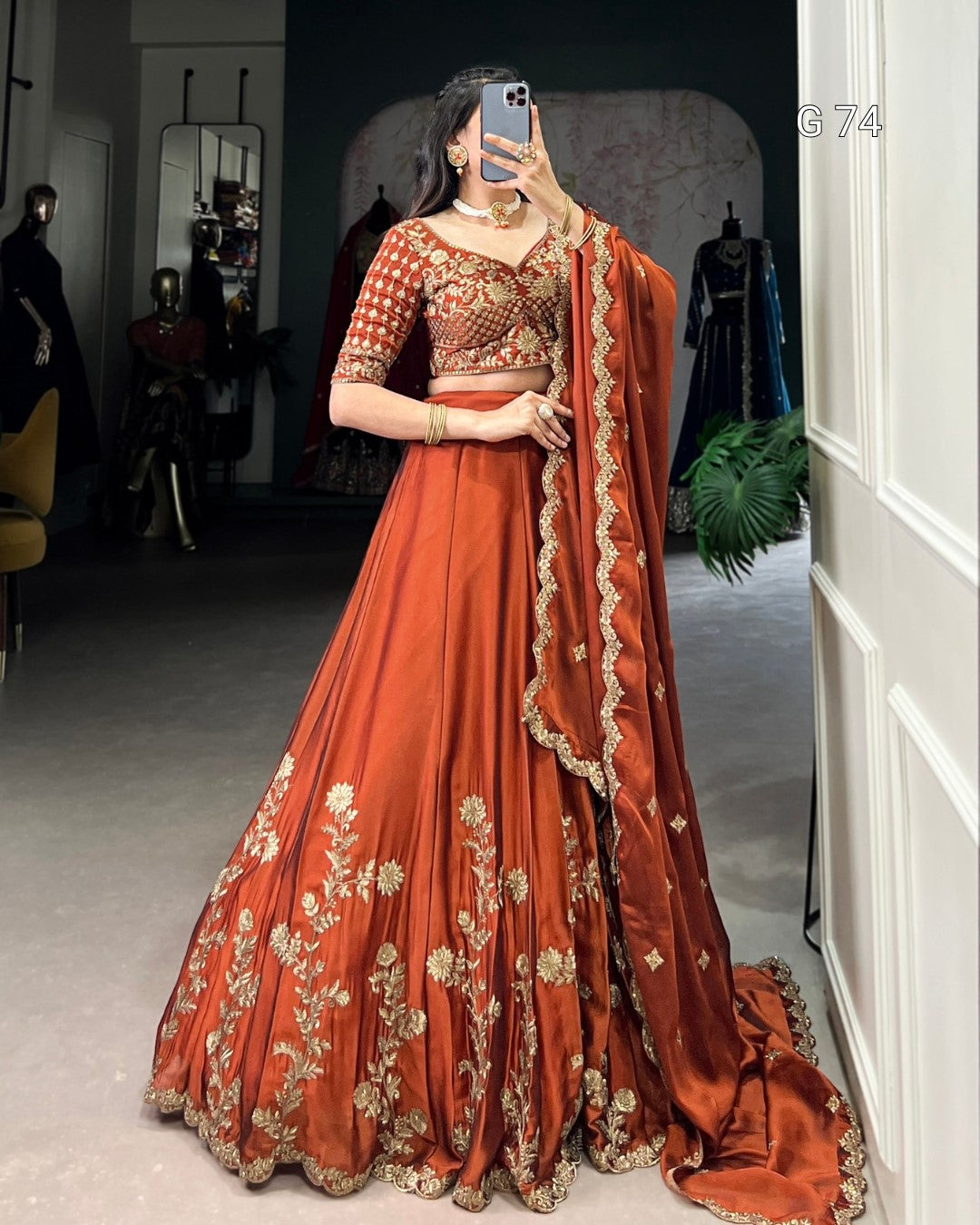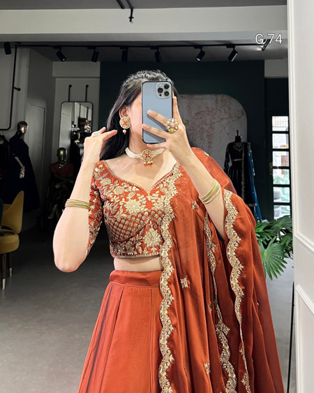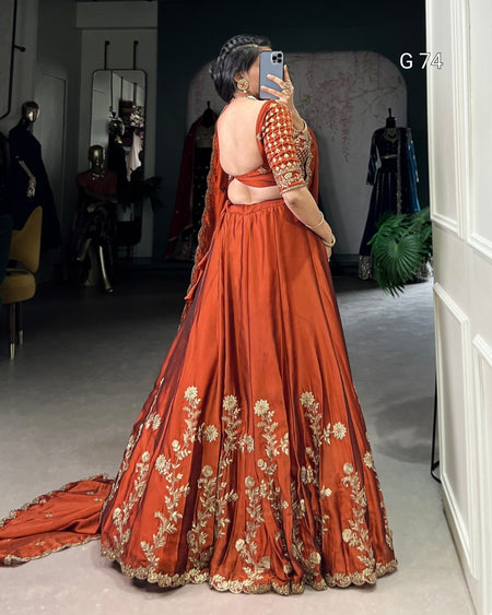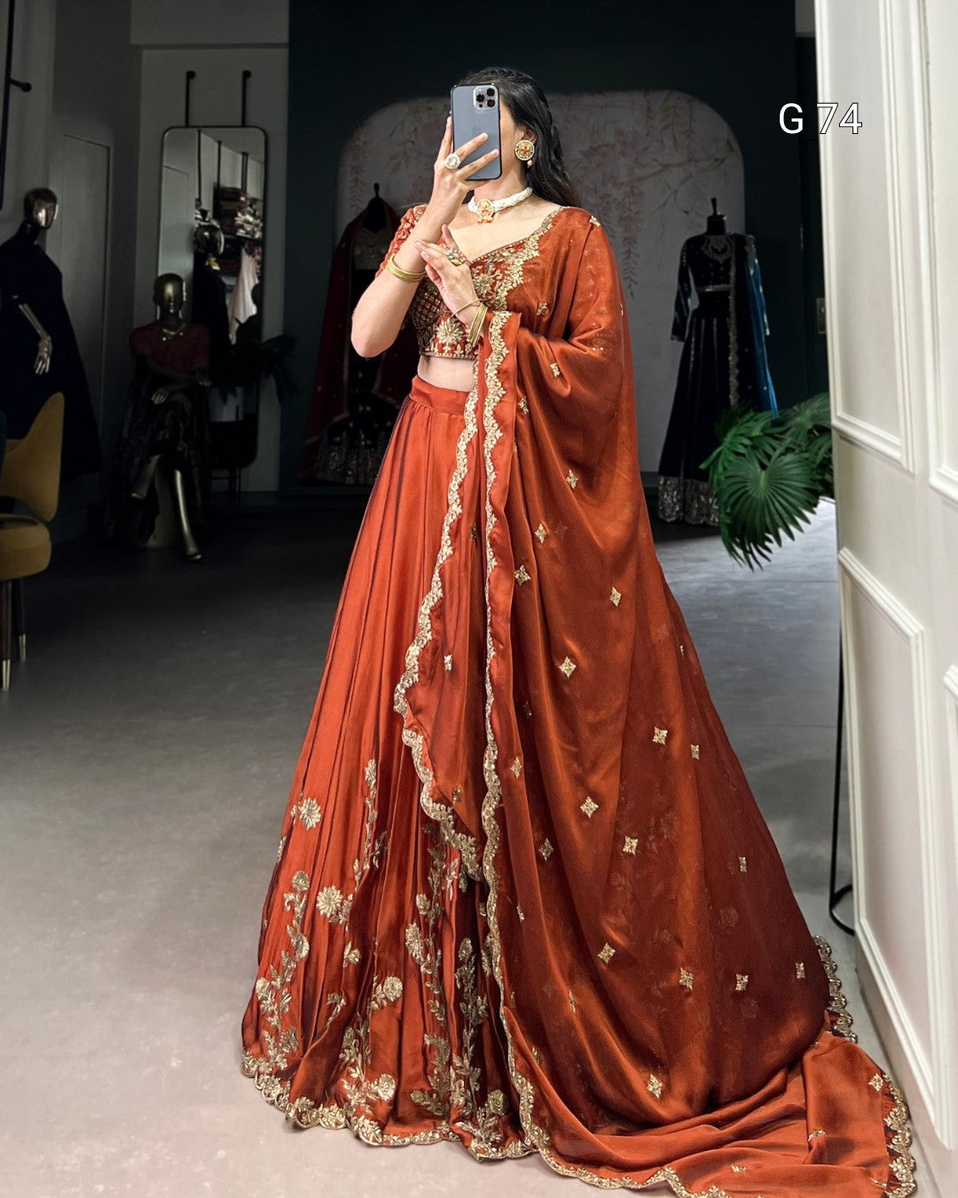 Rangoli Silk Lehenga with Sequins & Thread Embroidery – G 74 Rust Orange
