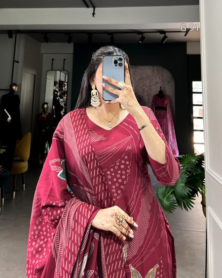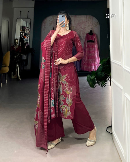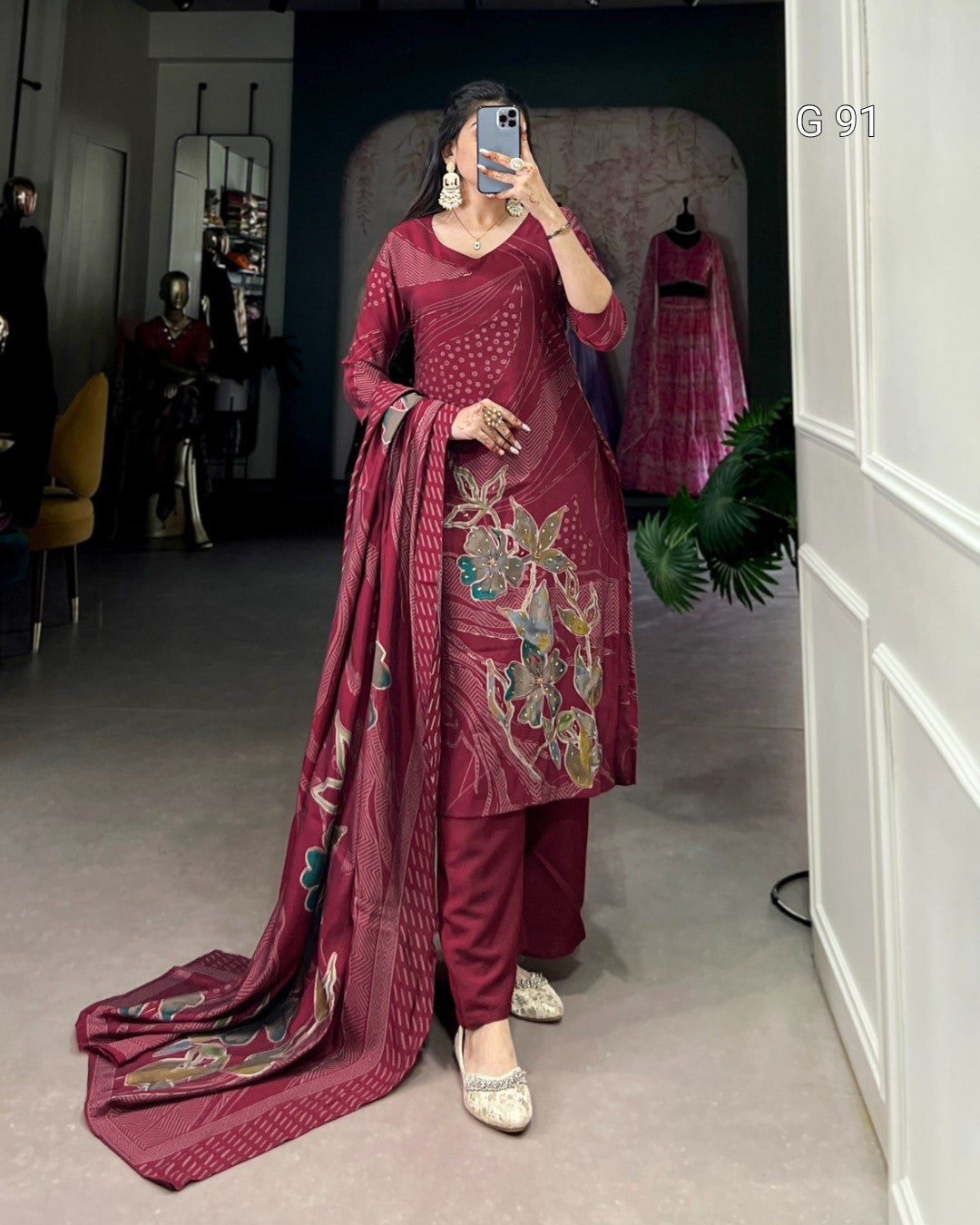 Roman Silk Top with Floral Print & Beads Handwork – G 91 Maroon