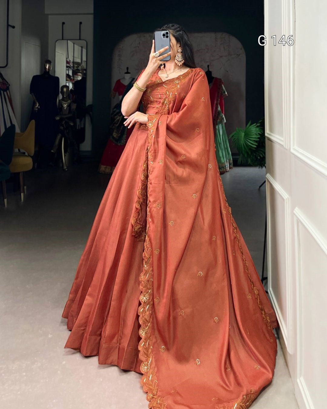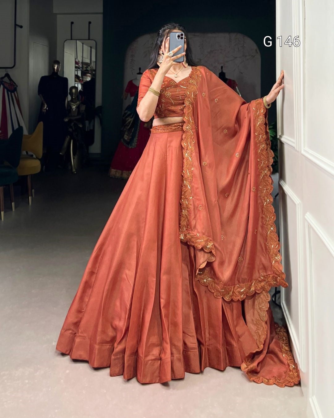 Rust Orange Korean Pure Tussar Lehenga with Sequins & Thread Embroidery – Bridal Lehenga Set-G 146 Rust Orange