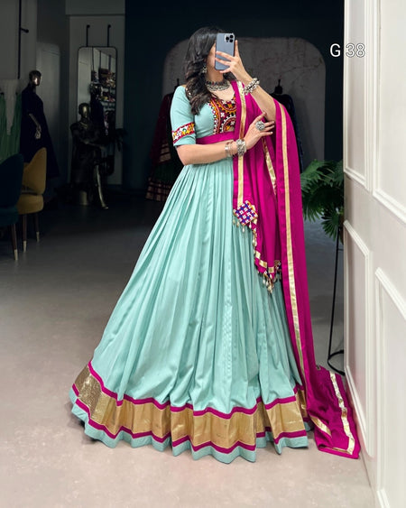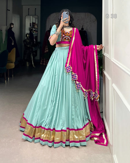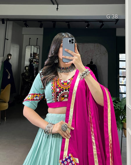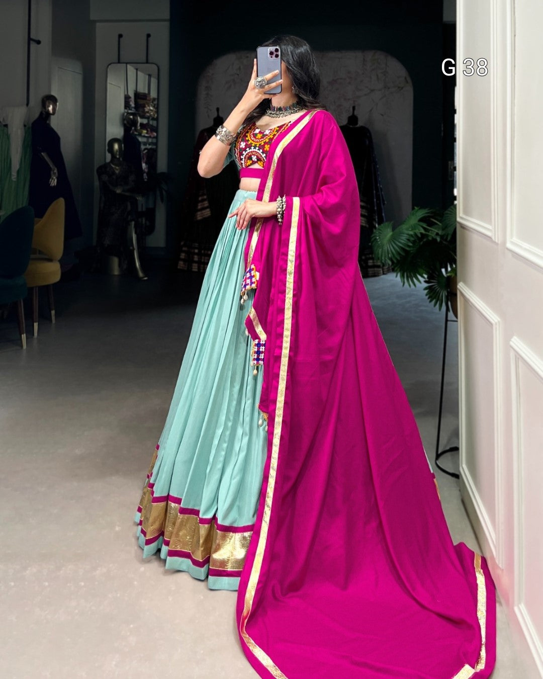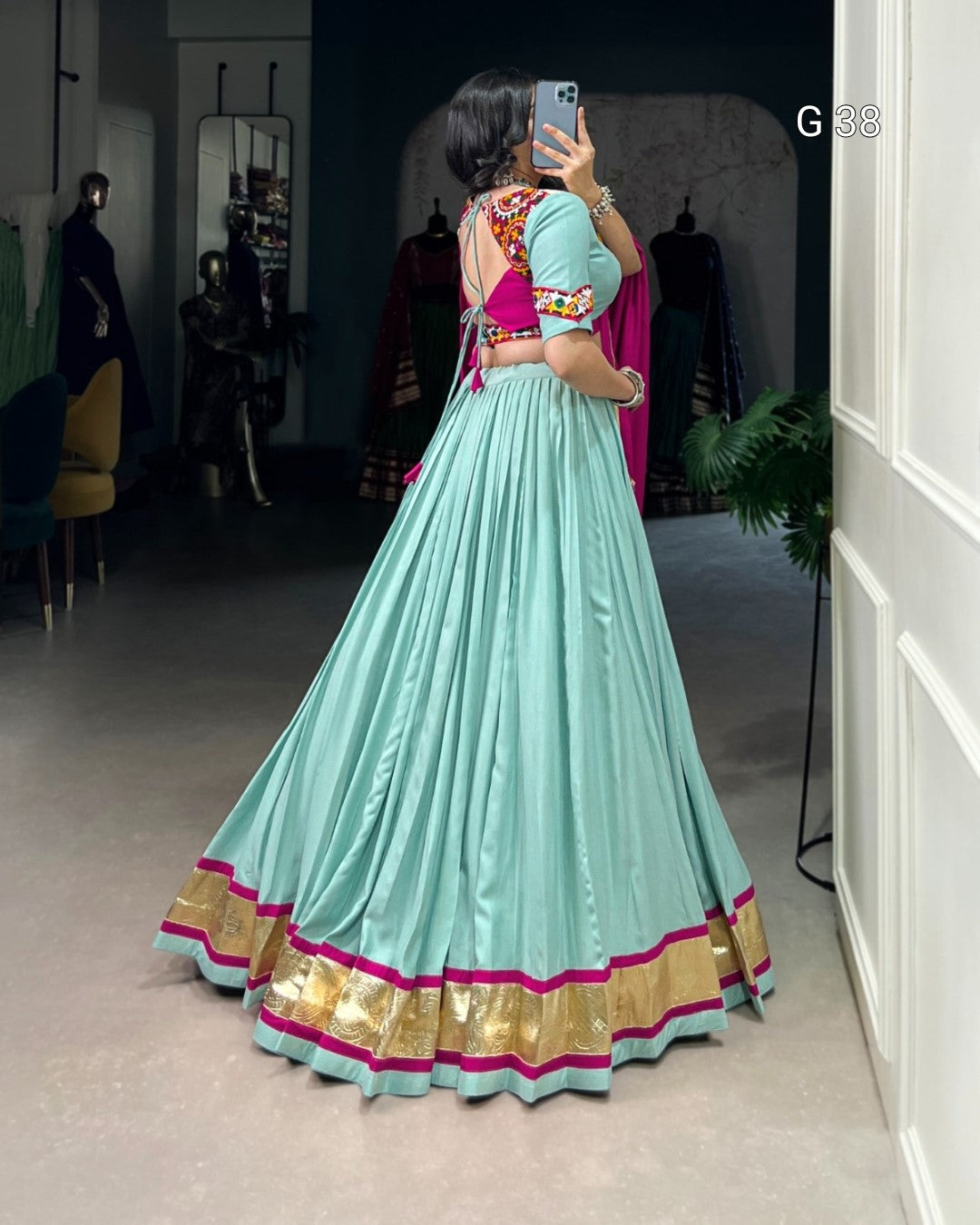 Sea Green Pure Rayon Lehenga with Embossed Design & Mirror Gamthi Work – Stitched Blouse and Dupatta - G 38 Sea Green