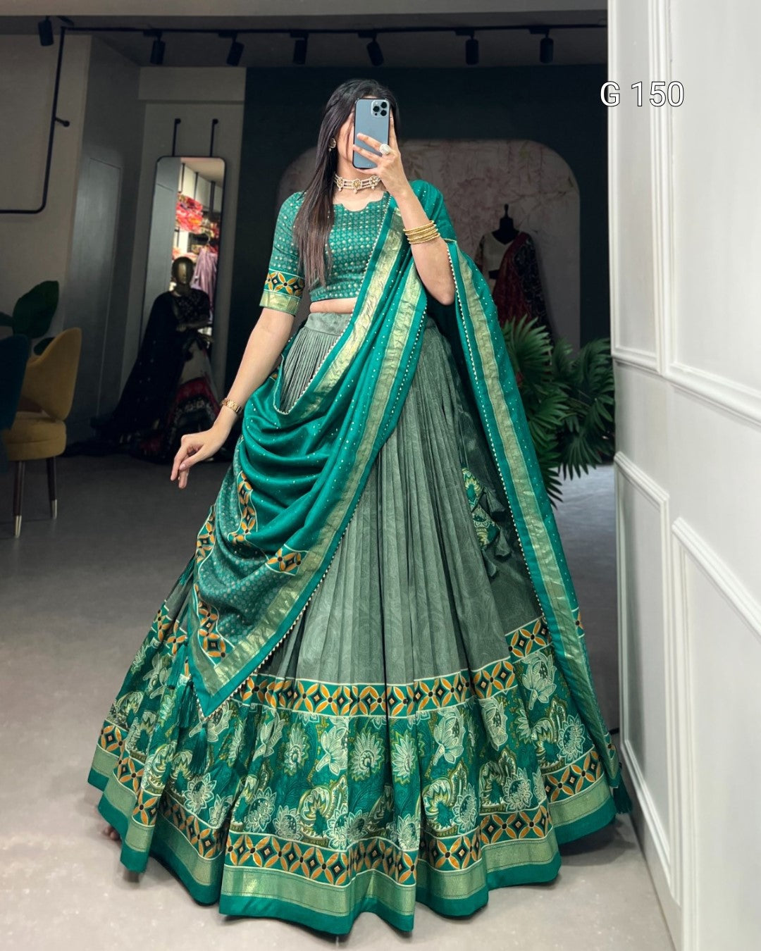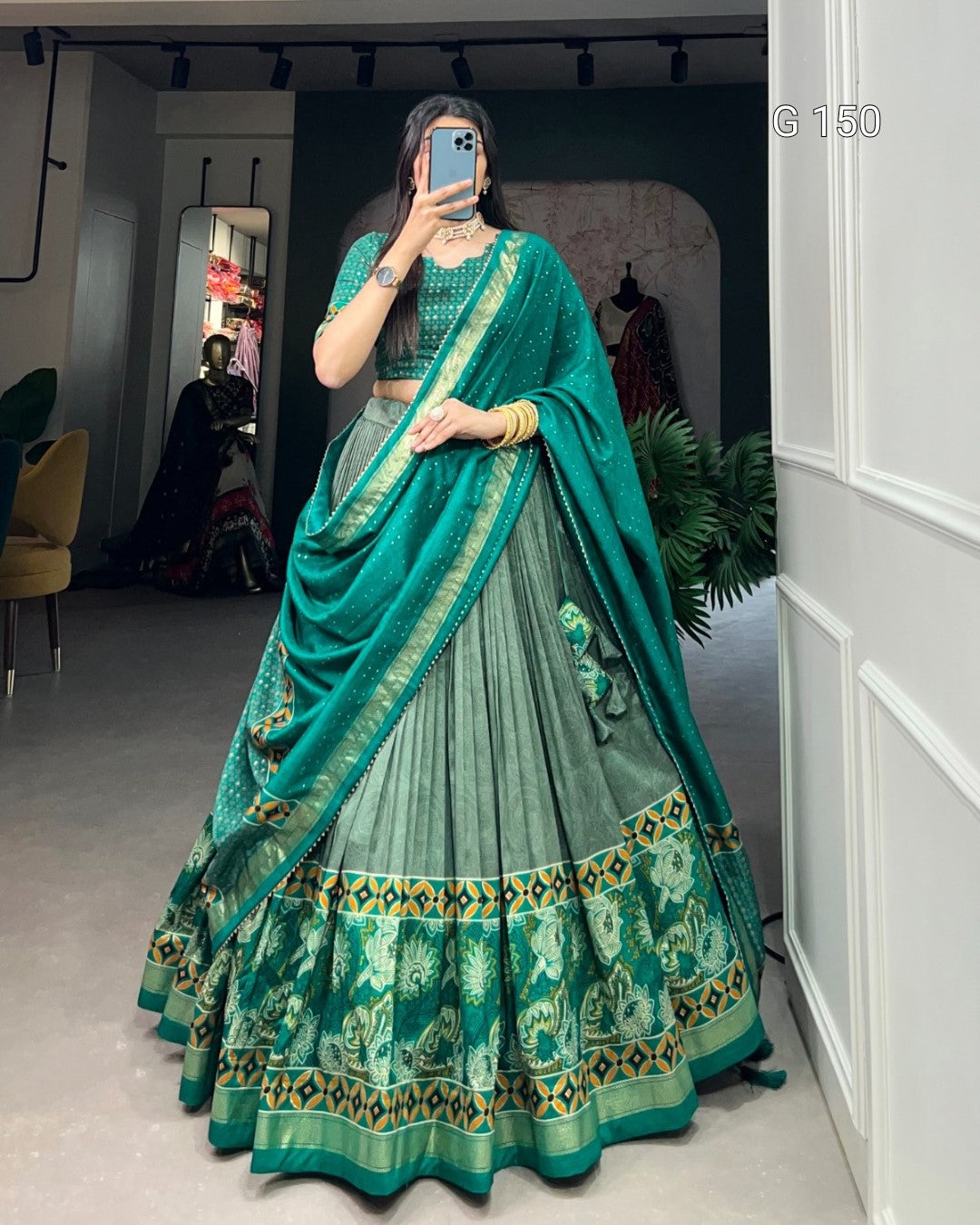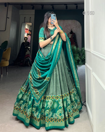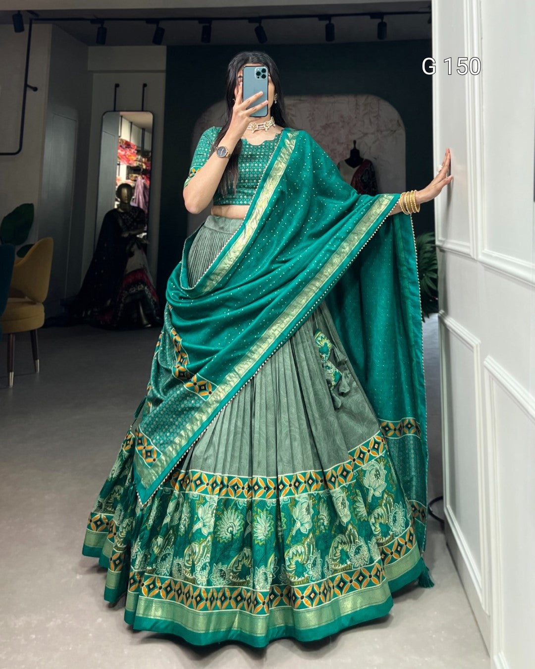 Sea Green Tussar Silk Lehenga with Floral & Foil Print – Elegant Bridal Lehenga Set-G 150 Sea green
