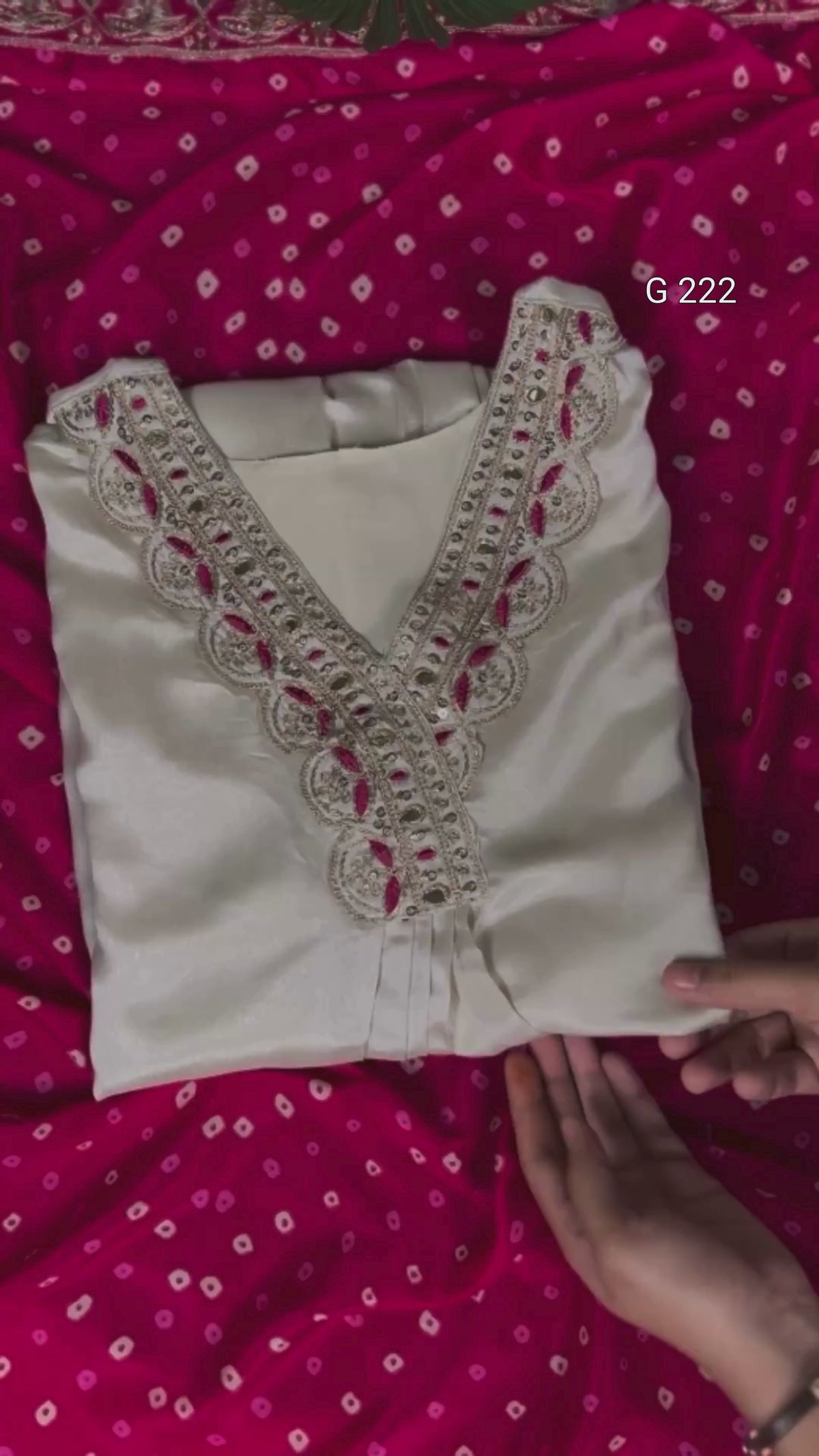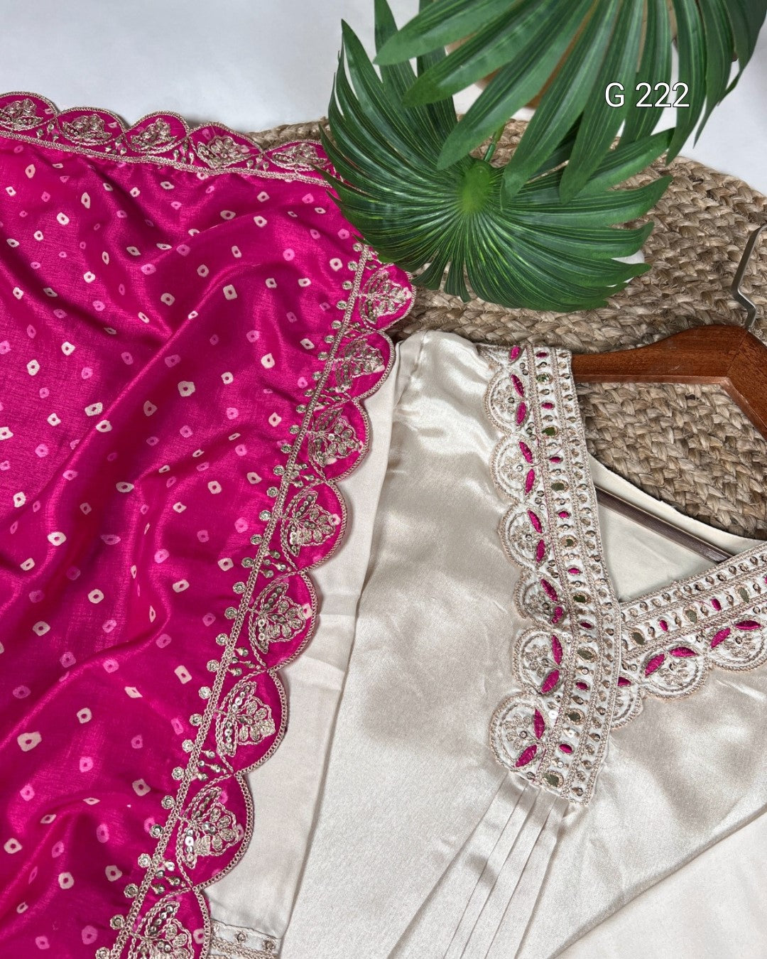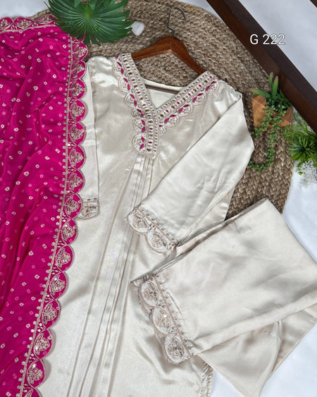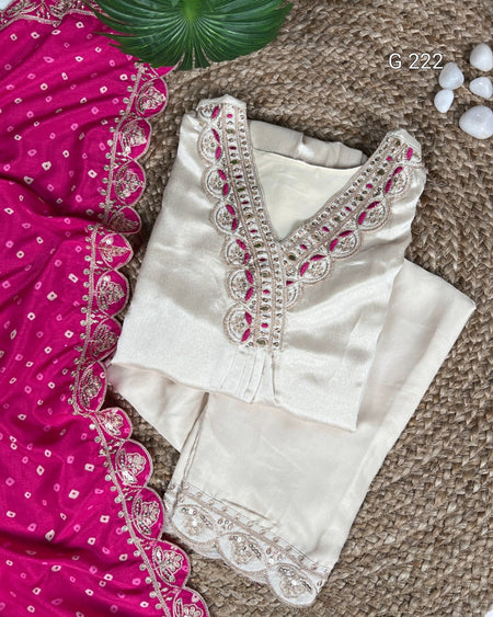 Sequins and Thread Embroidery Moonga Silk Top & Bottom with Bandhej Print Dupatta – G 222 Cream