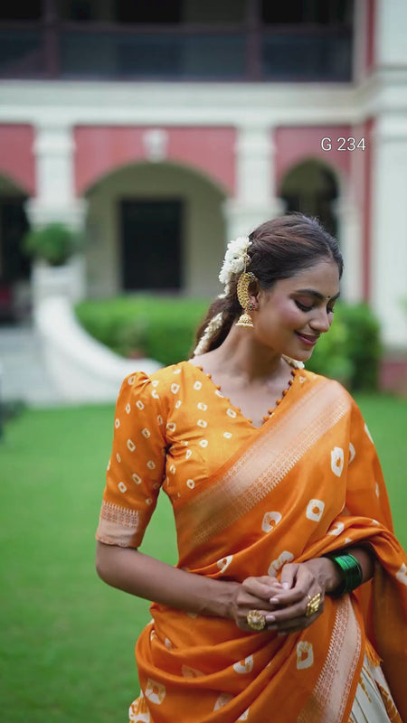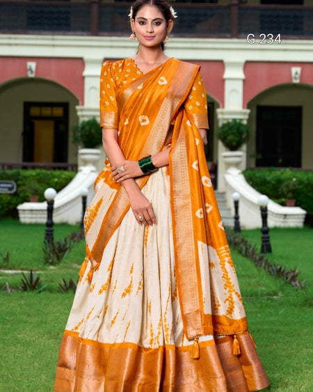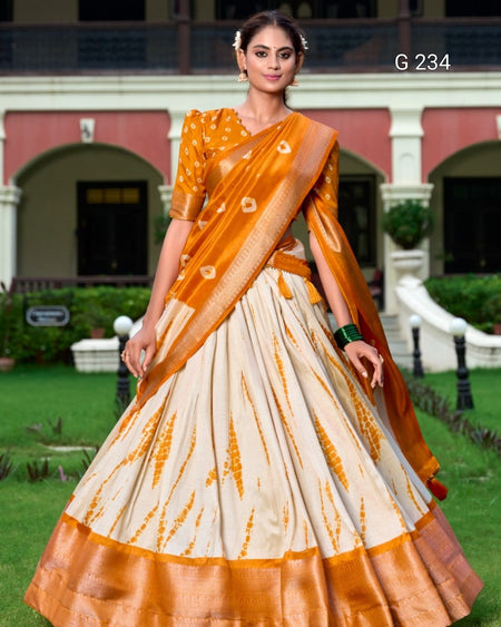 Shibori Print Dola Silk Lehenga with Zari Weaving Border – G 234 Mustard
