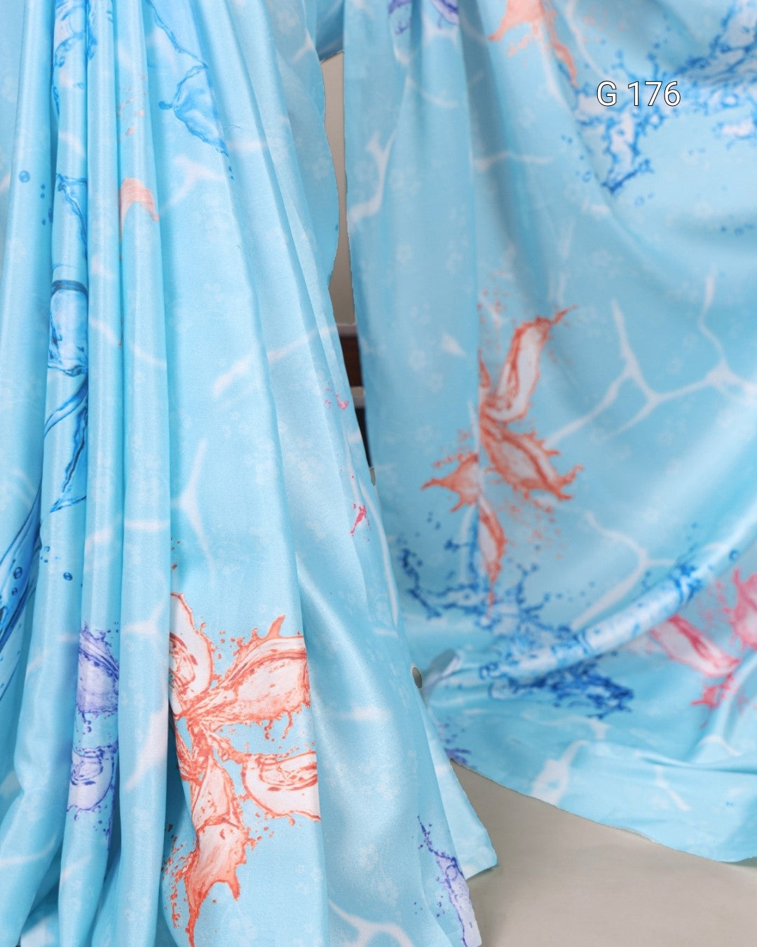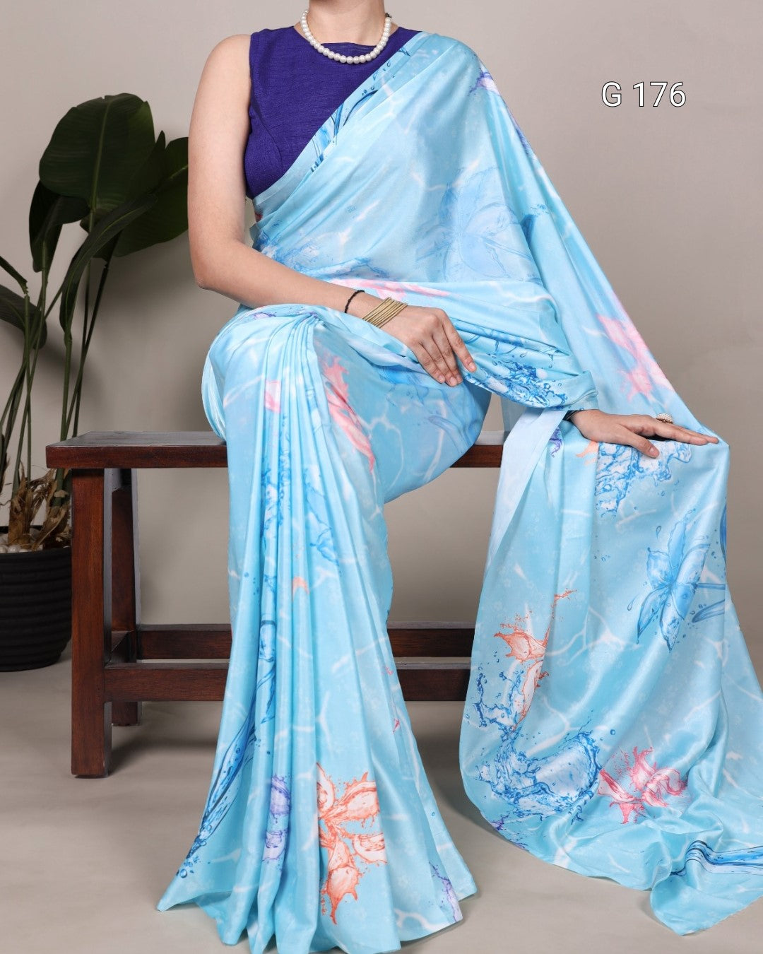 Sky Blue Satin Silk Saree with Floral Print – G 176 Sky Blue