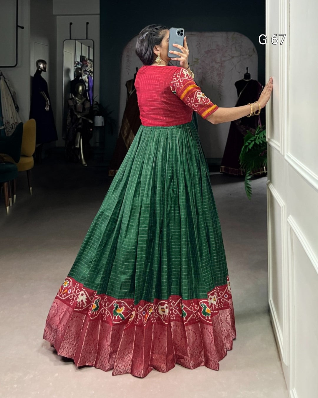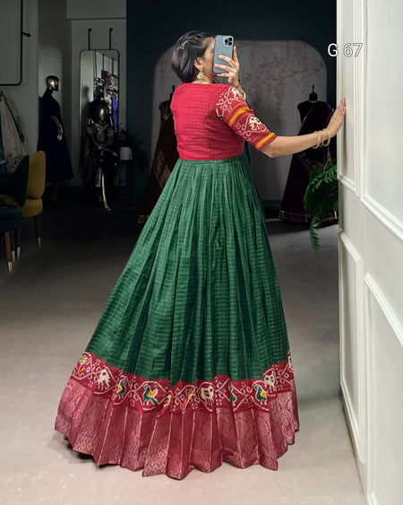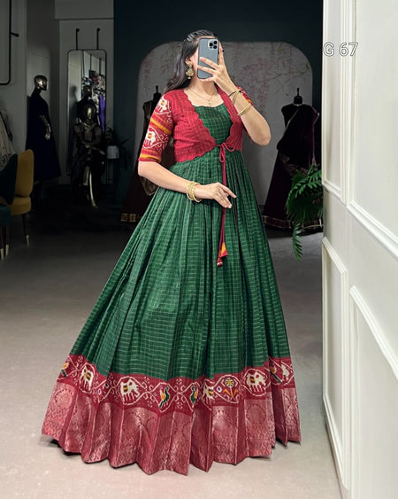 Tasar Chex Gown with Patola Print & Weaving Work Border – G 67 Green