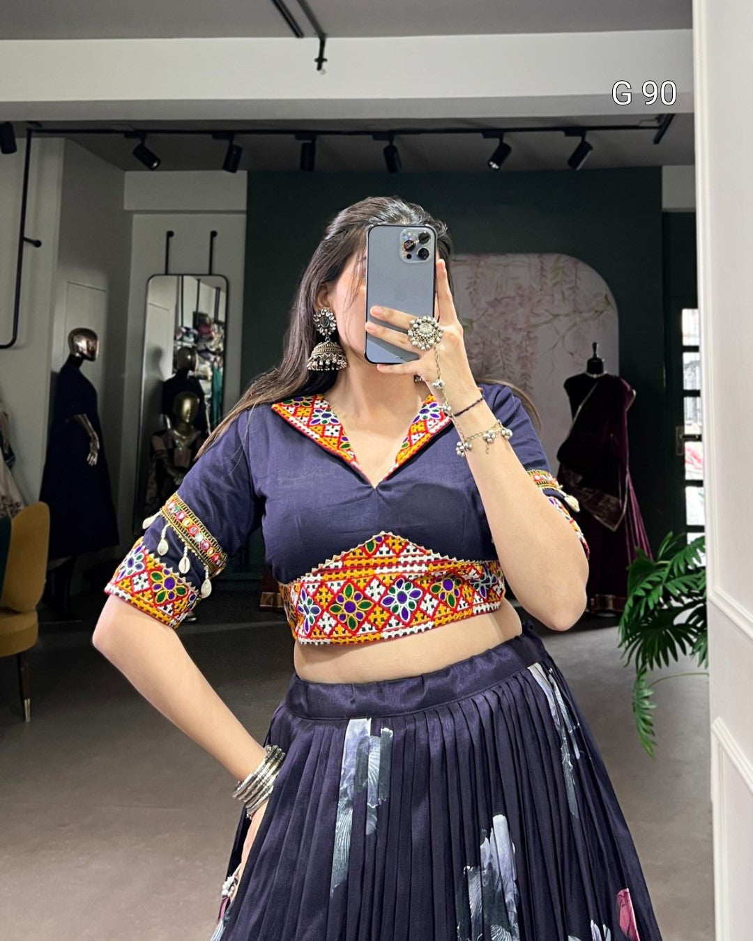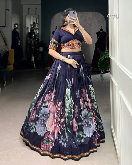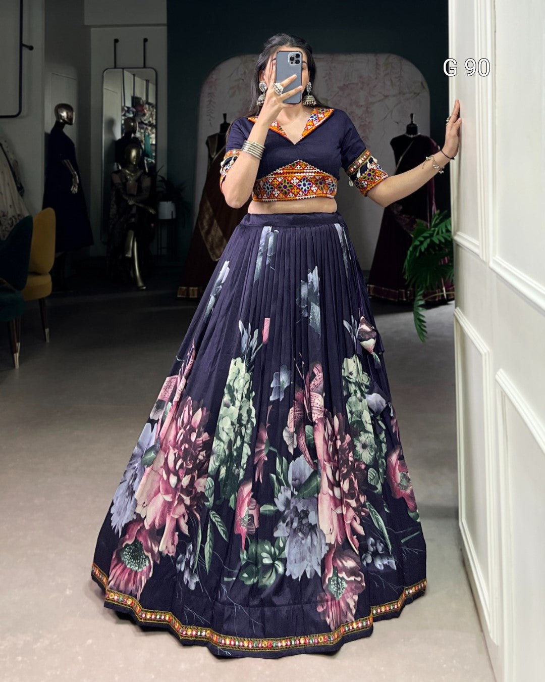 Tasar Silk Lehenga with Floral Print & Paper Mirror Lace Touch Up – G 90 Blue