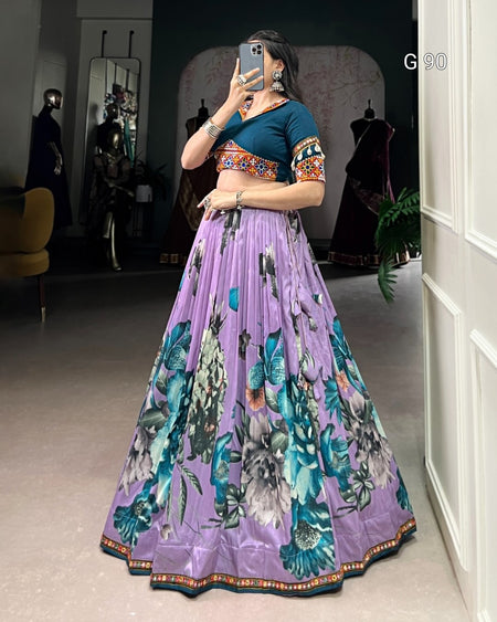 Tasar Silk Lehenga with Floral Print & Paper Mirror Lace Touch Up – G 90 Launder