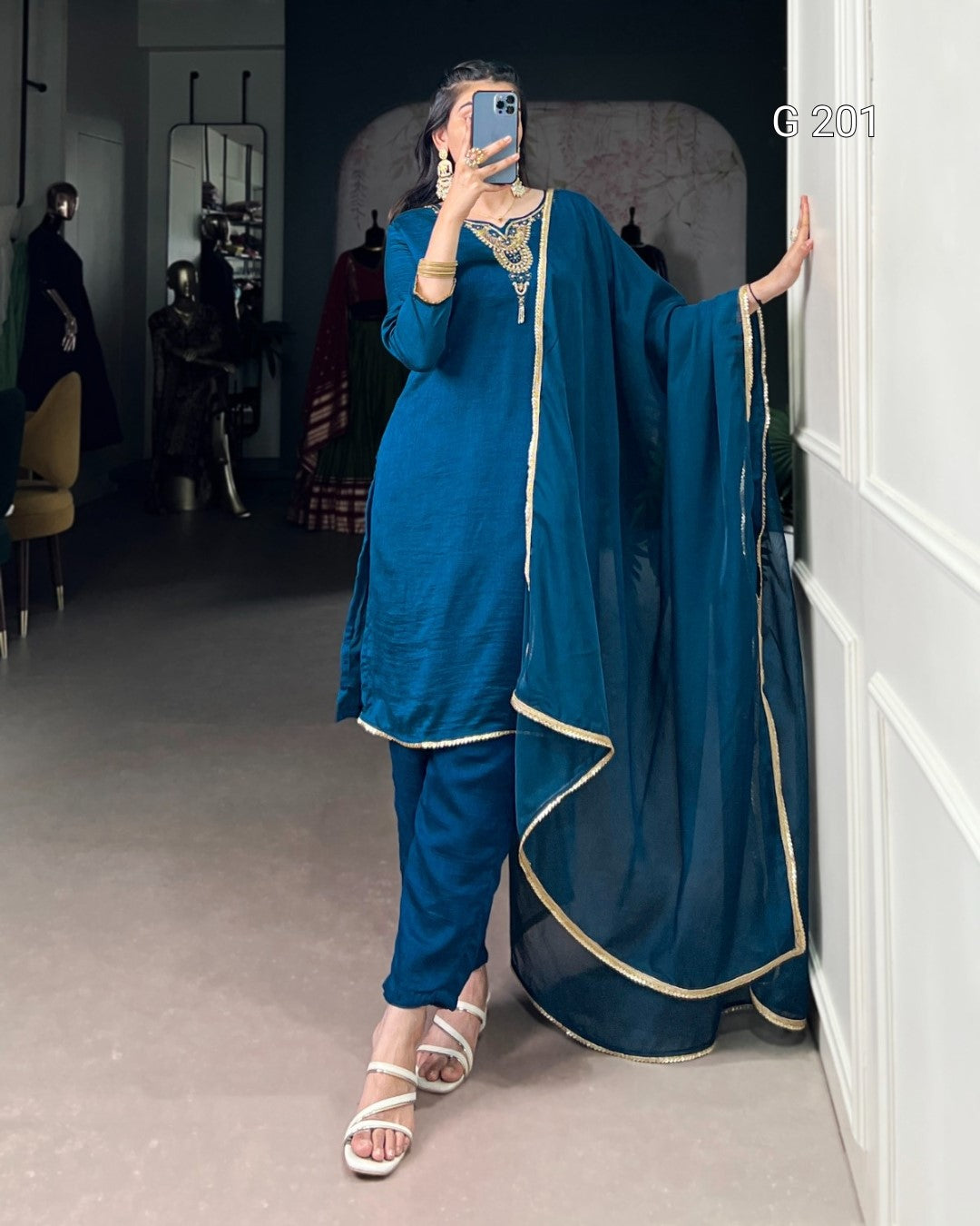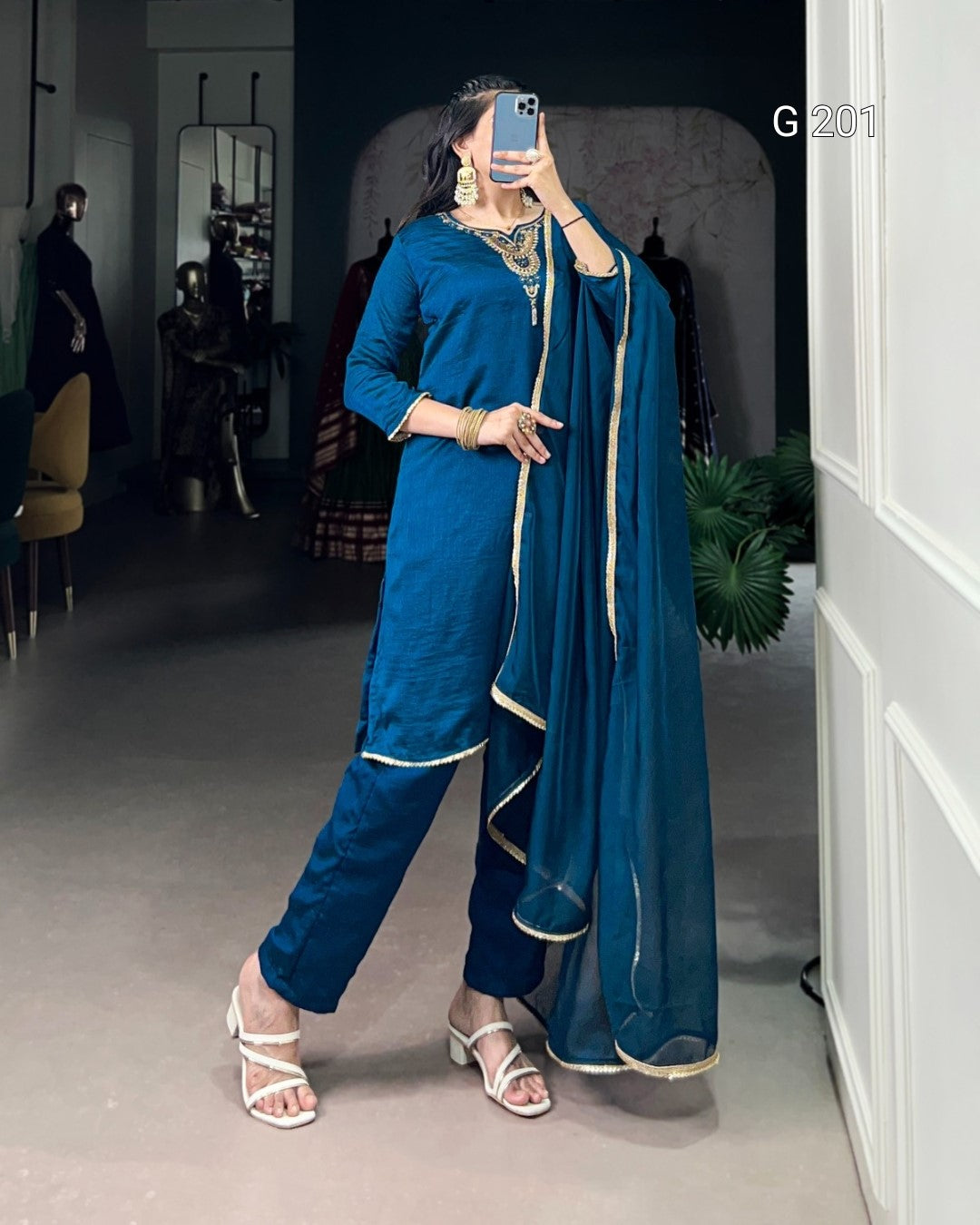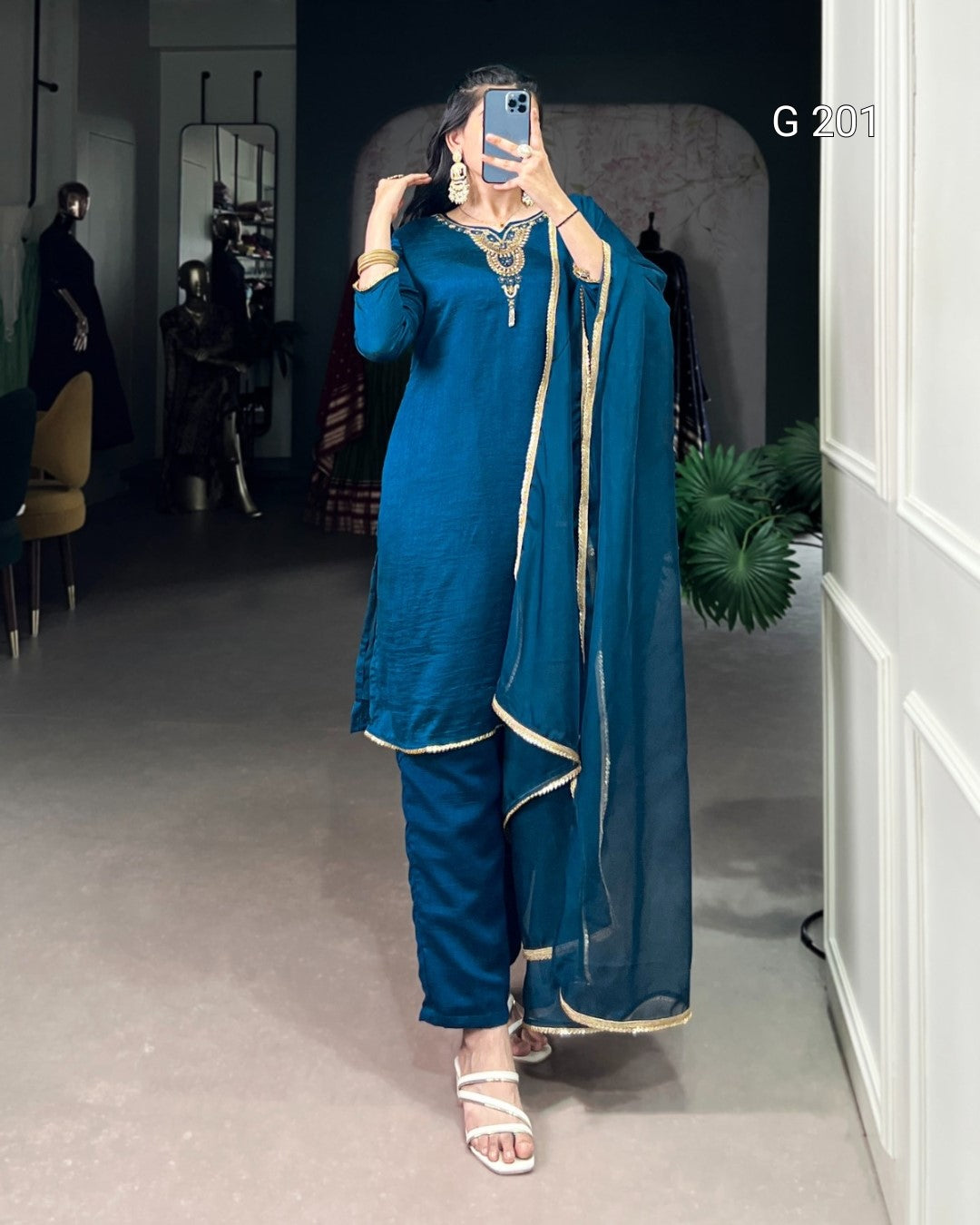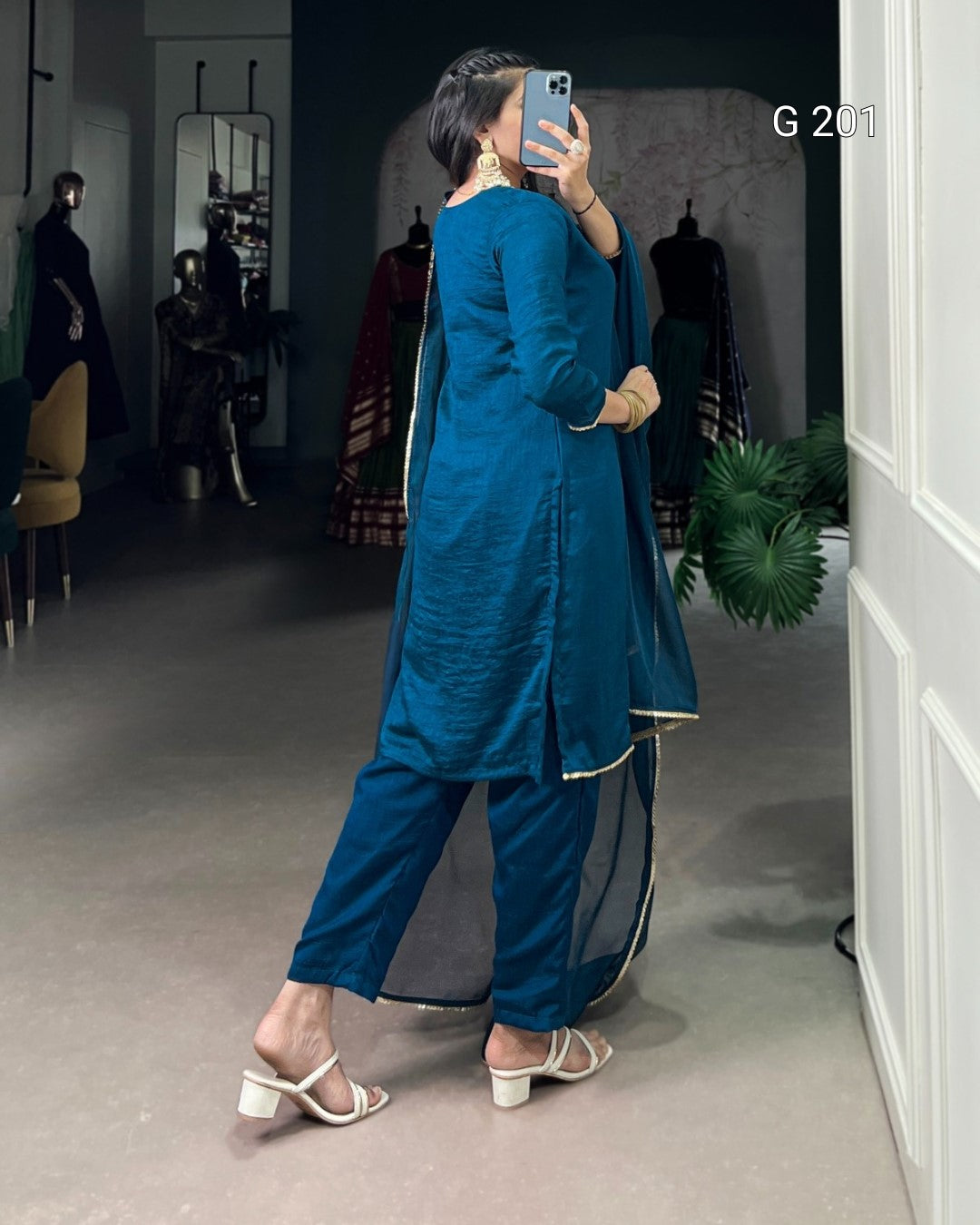 Teal Vichitra Silk Top with Beads Handwork and Sequins Work, Plain Bottom & Sequins Organza Dupatta – G 201 Teal