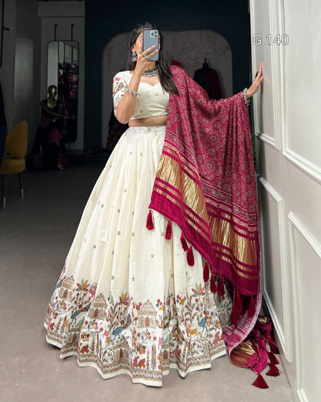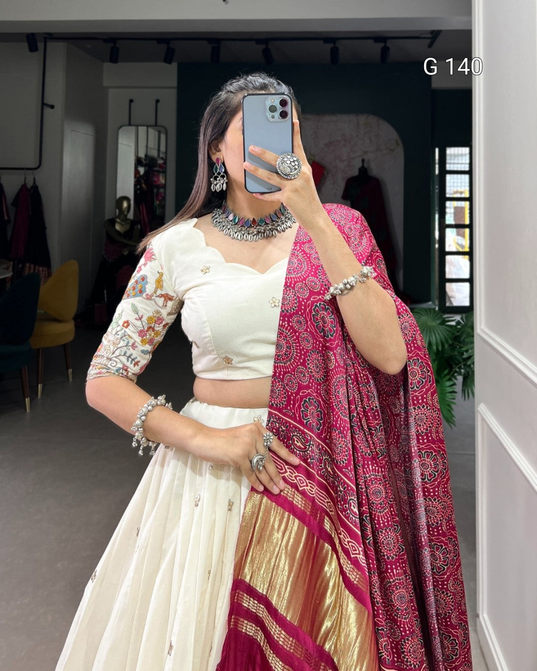Temple Khadi Cotton Lehenga with Sequins & Thread Embroidery Work and Tassel Dupatta-G 140 Temple