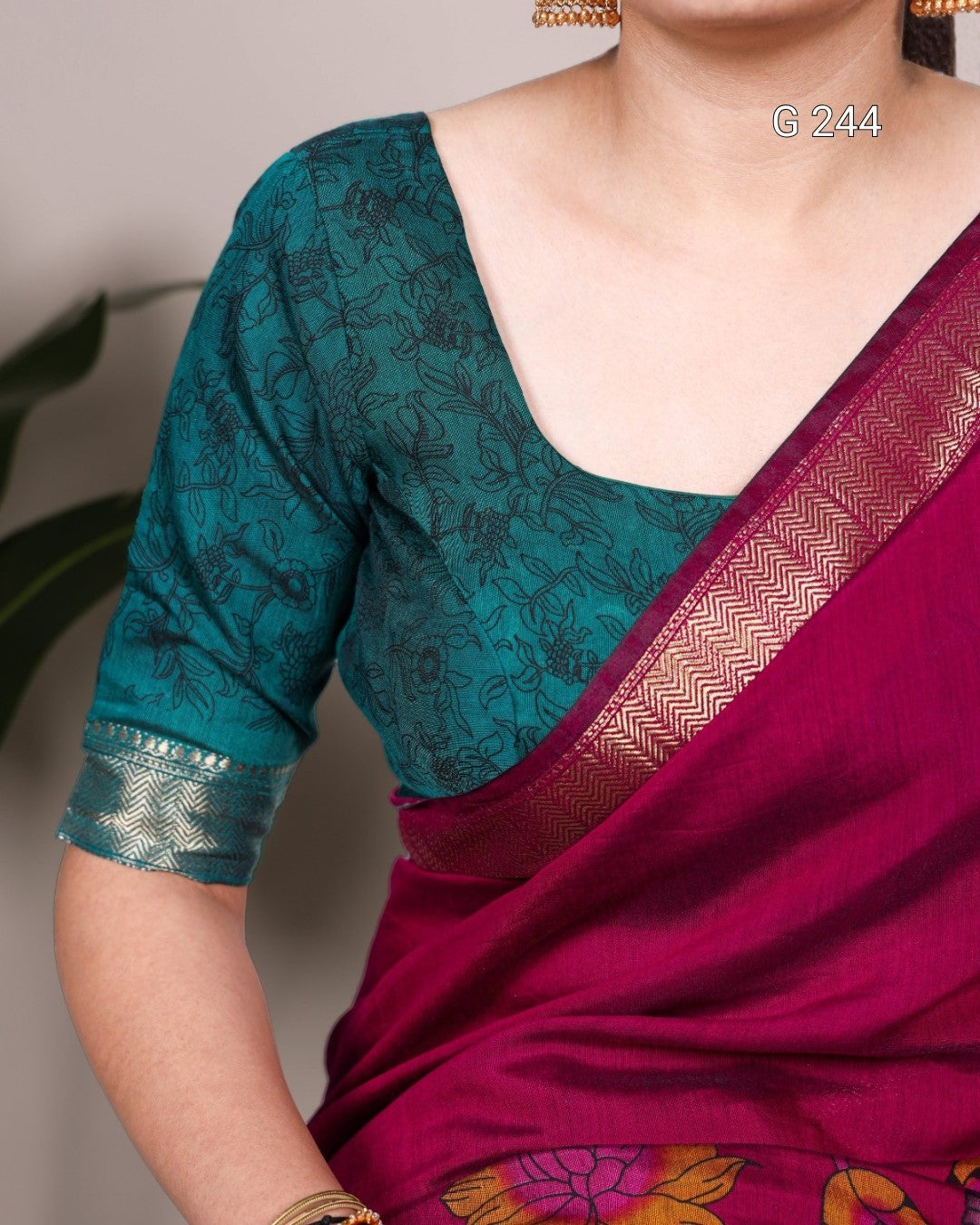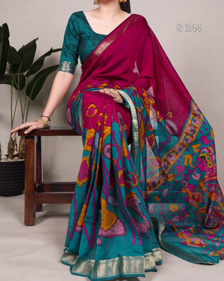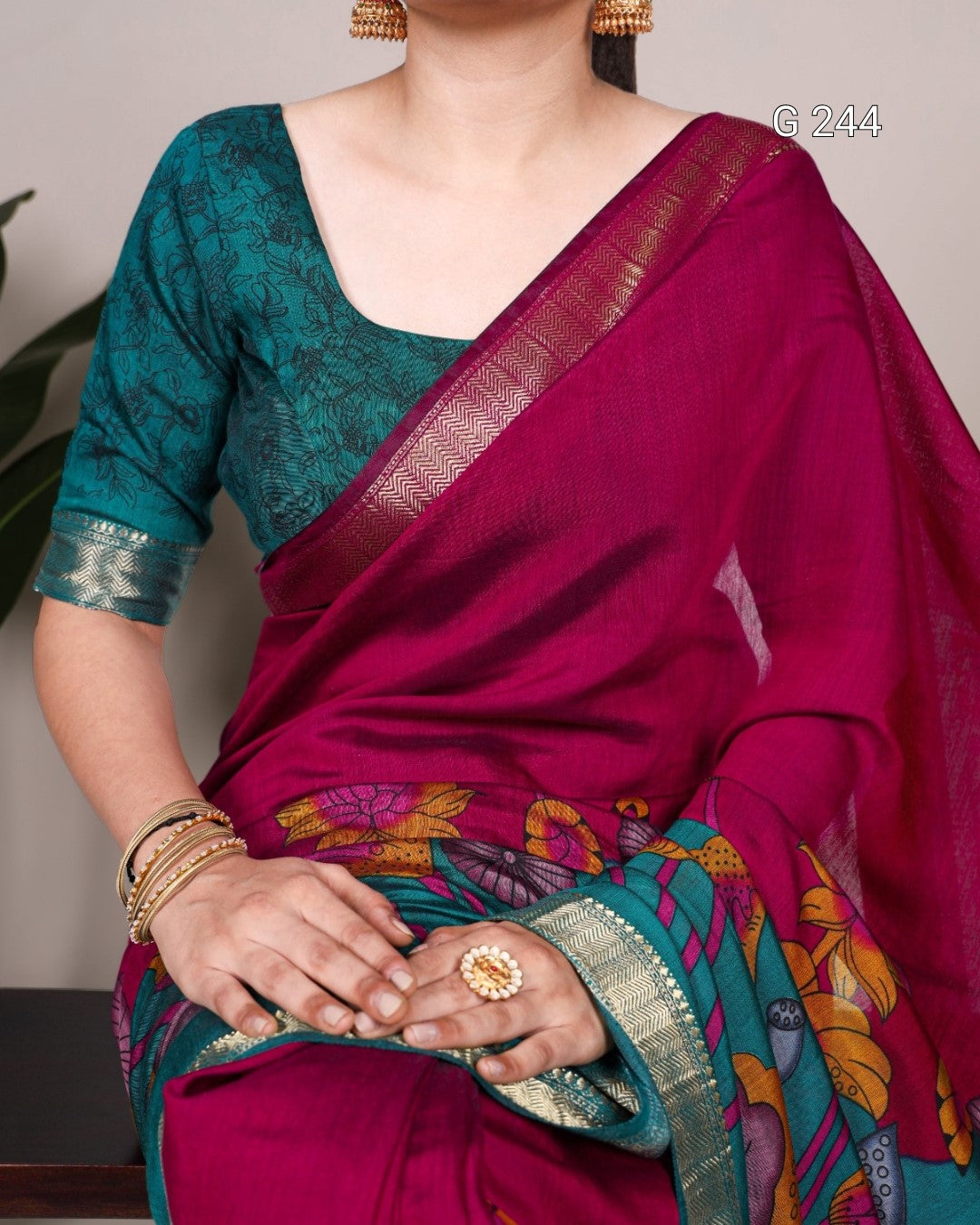 Traditional Floral Printed Polyester Viscose Chanderi Saree with Zari Weaving – G 244 Pink