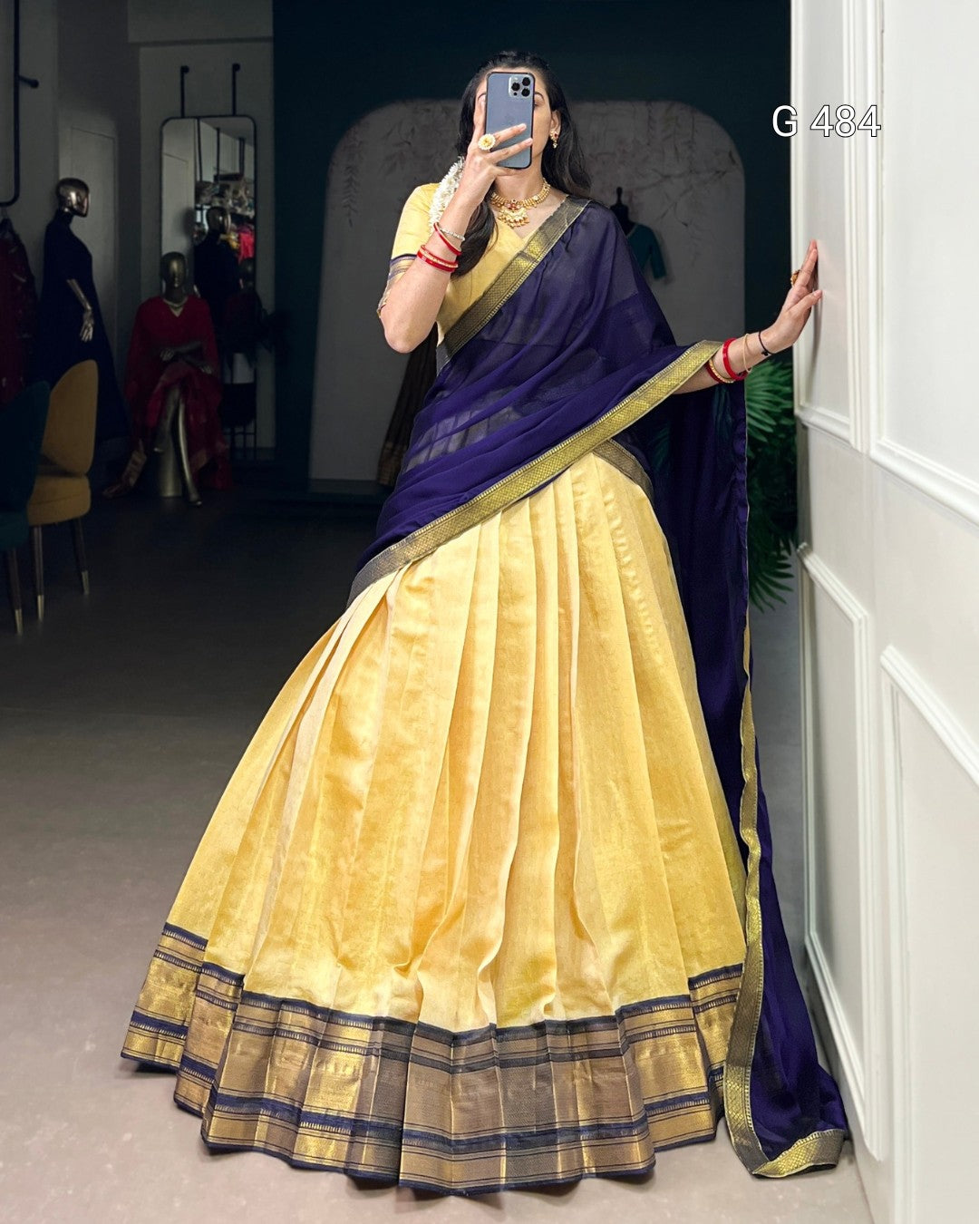The golden charm of zari, the grace of Kanchipuram — a half saree that celebrates timeless tradition 🪷