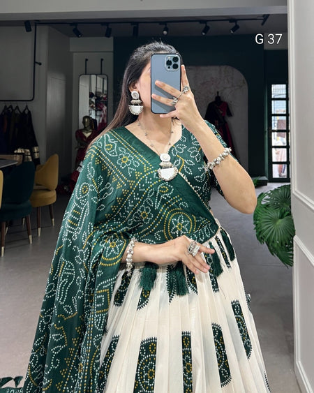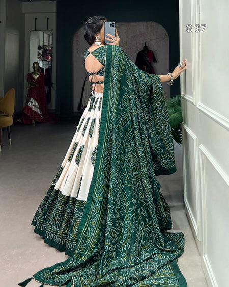 Tussar Silk Bandhej Print Lehenga with Gotta Patti Lace Border & Tassels – G 37 Green