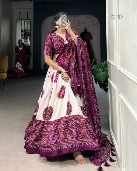 Tussar Silk Bandhej Print Lehenga with Gotta Patti Lace Border & Tassels – G 37 Wine