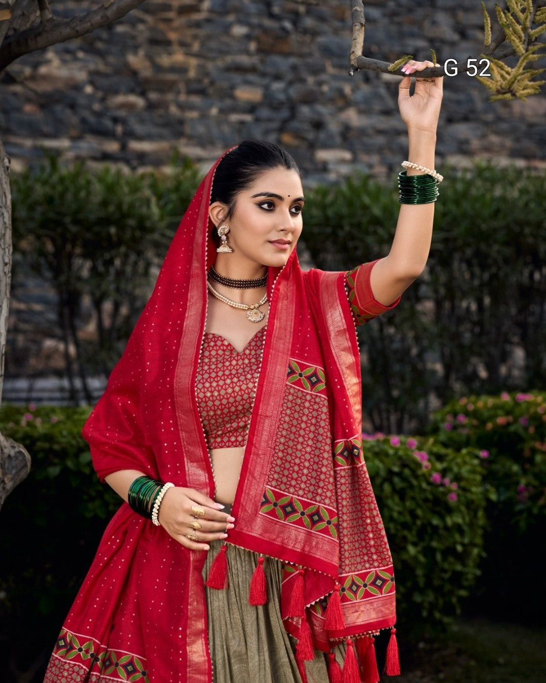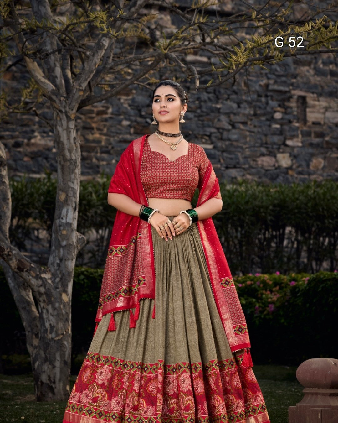 Tussar Silk Lehenga with Foil Print & Heavy Tassels – G 52 Mehendi
