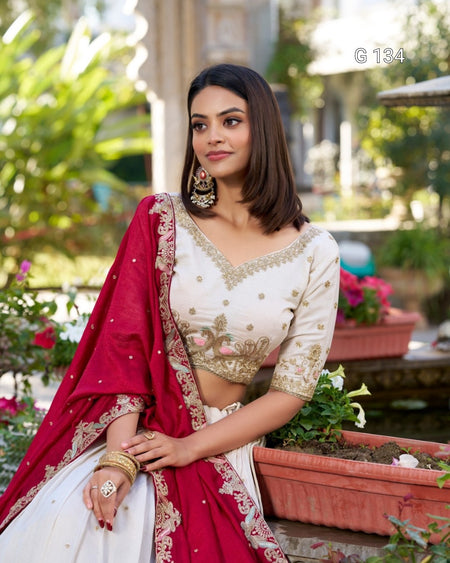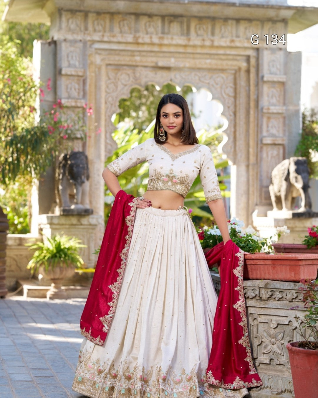 Vichitra Silk Sequins & Thread Embroidery Lehenga with Lace Border & Butties – G 134 Off White
