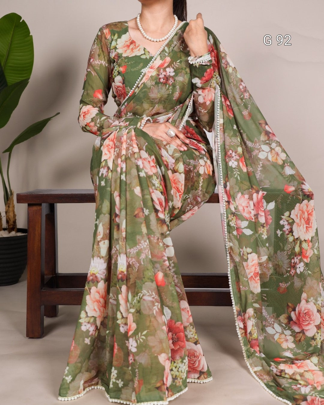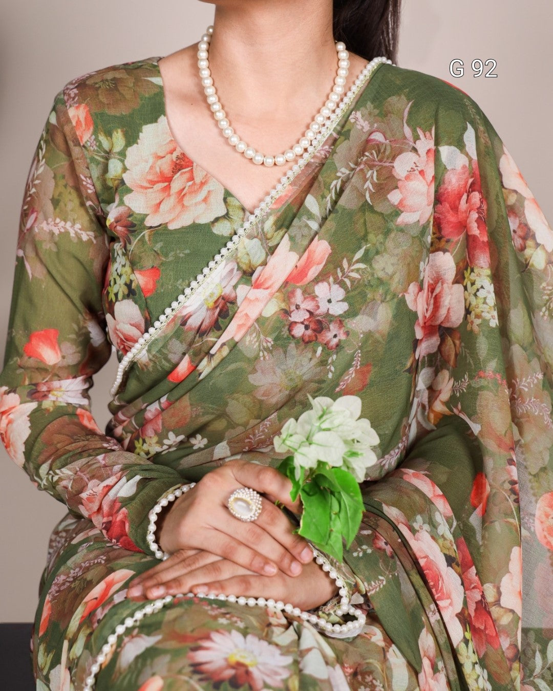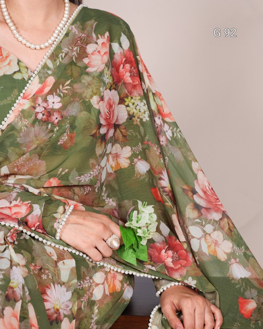 Weightless Marbal Saree with Printed Design & Pearl Lace Border – G 92 Mehendi