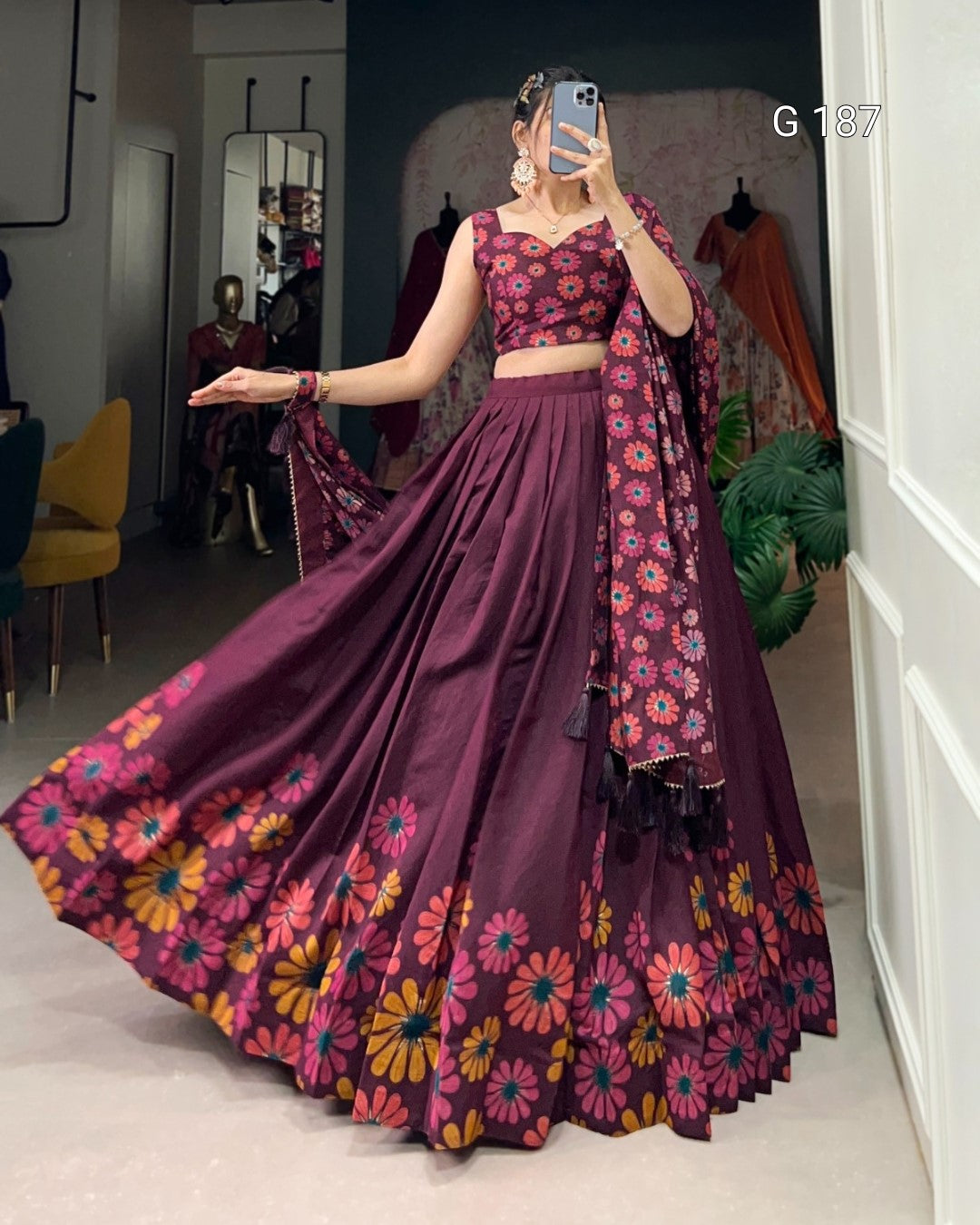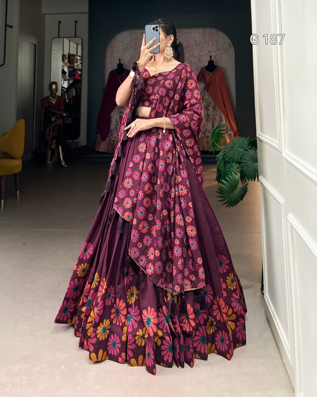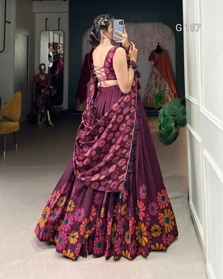 Wine Tasar Silk Lehenga with Floral Print & Foil Work – G 187 Wine