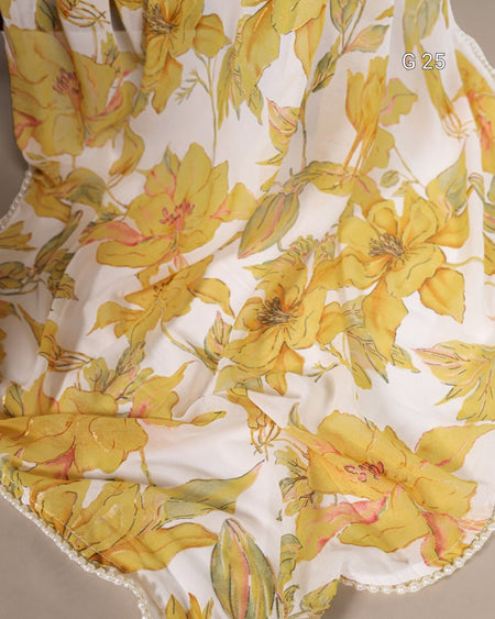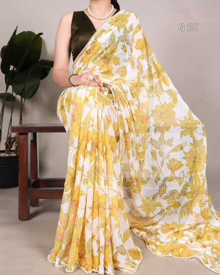 Yellow Weightless Marbal Saree with Floral Print & Pearl Lace Border – Unstitched Blouse in Moonga Silk - G 25 Yellow